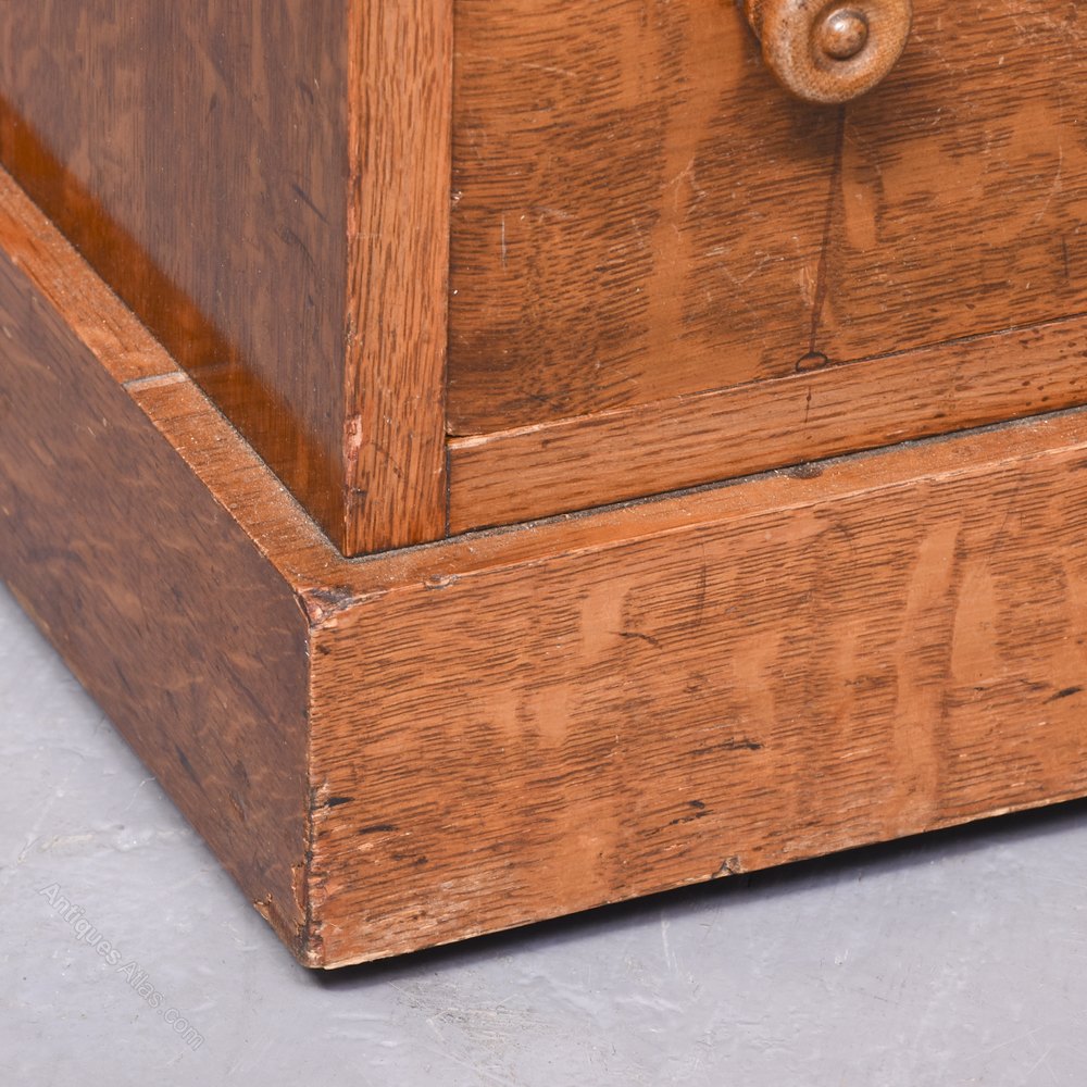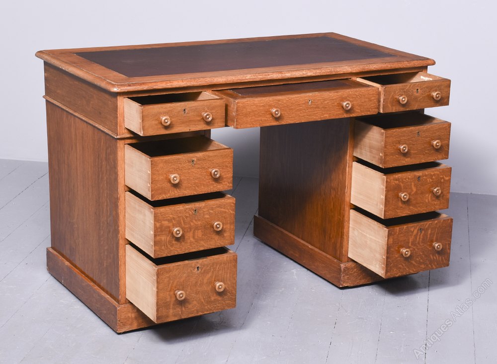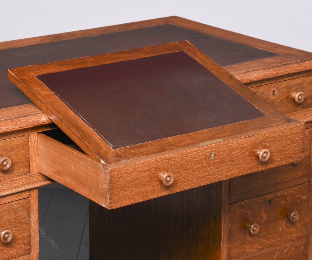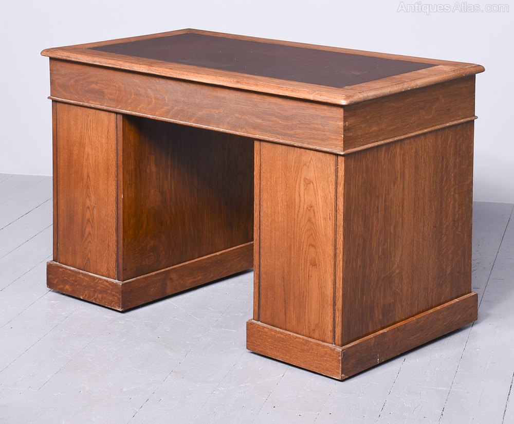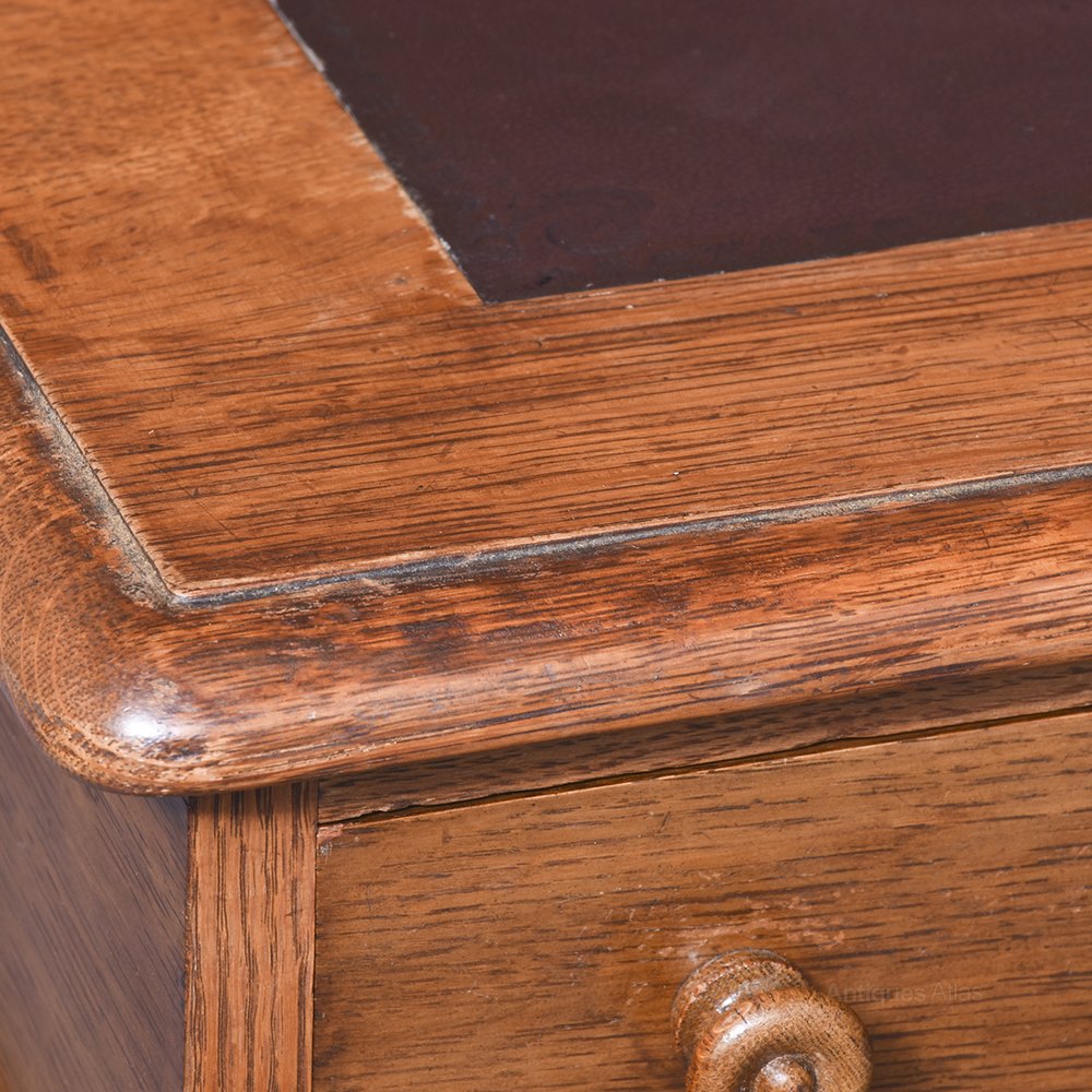 Circa 1860. A quality mid Victorian oak pedestal desk. The top with brown leatherette insert with broad banding and simple moulded fore edge. The frieze with 3 drawers, each with a pair of turned wooden knobs, the largest long drawer, with a writing slope with similar covering to the top. Sitting on a pair of pedestals, each with a bank of three graduating drawers. The desk is polished on all sides, making it free standing. All resting on a large rectangular plinth with concealed castors beneath.