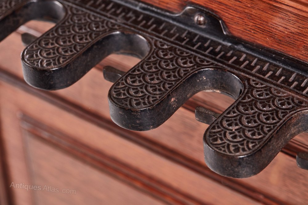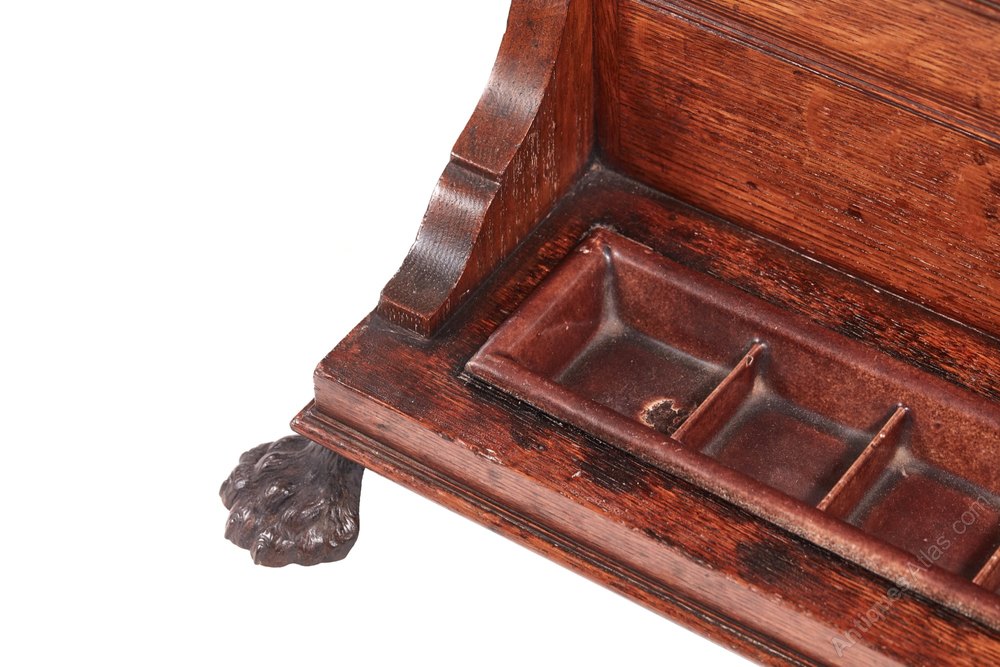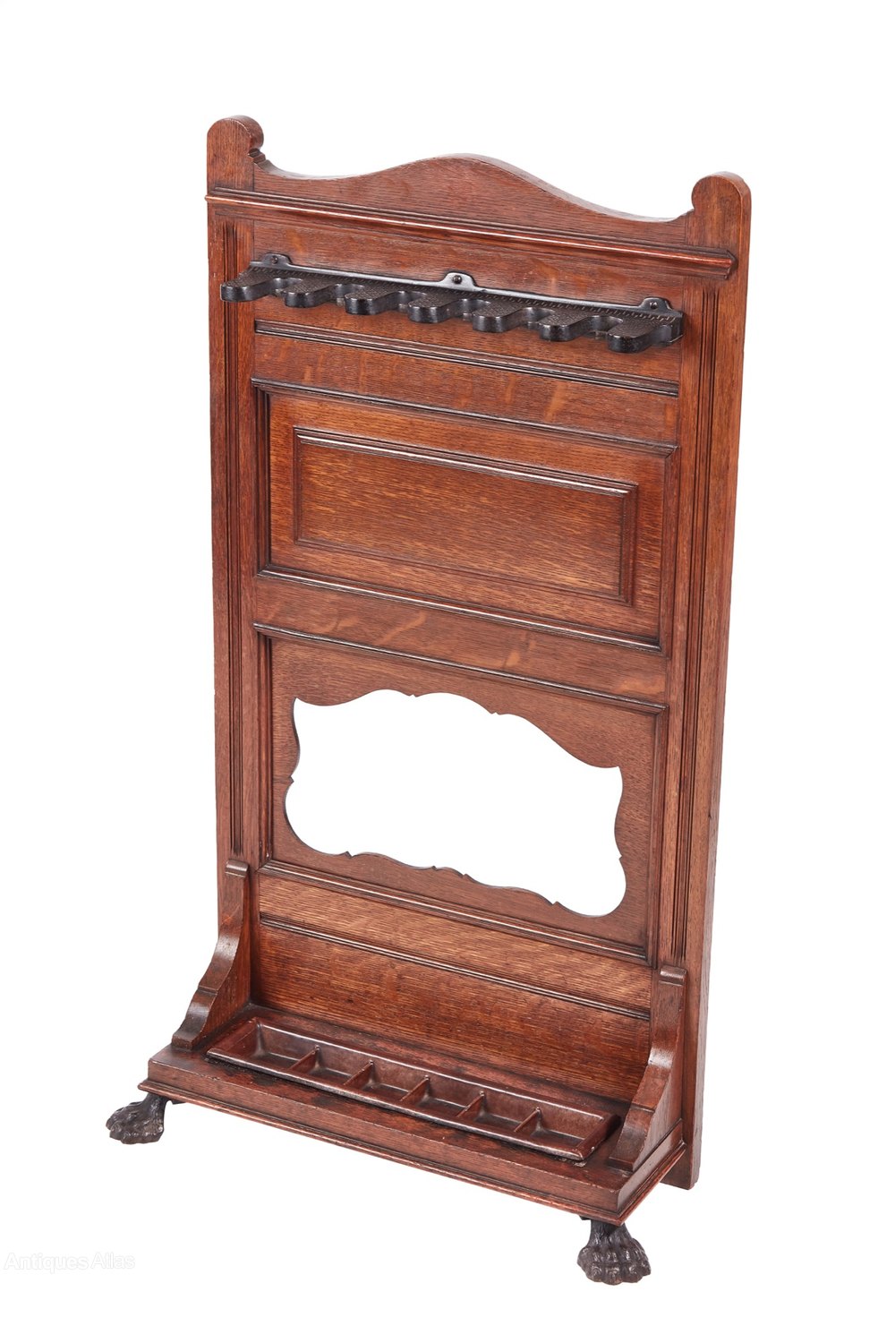 Victorian oak snooker cue stand,with a shaped top,original cast iron cue holders and removable tray,standing on original cast iron paw feet