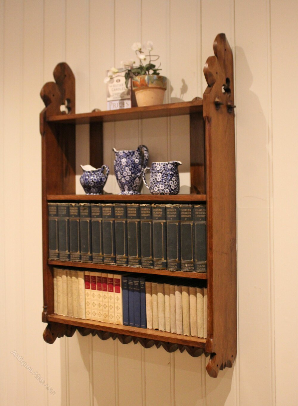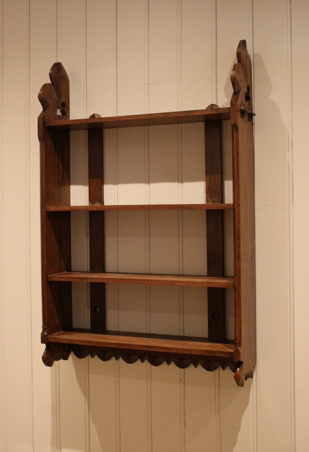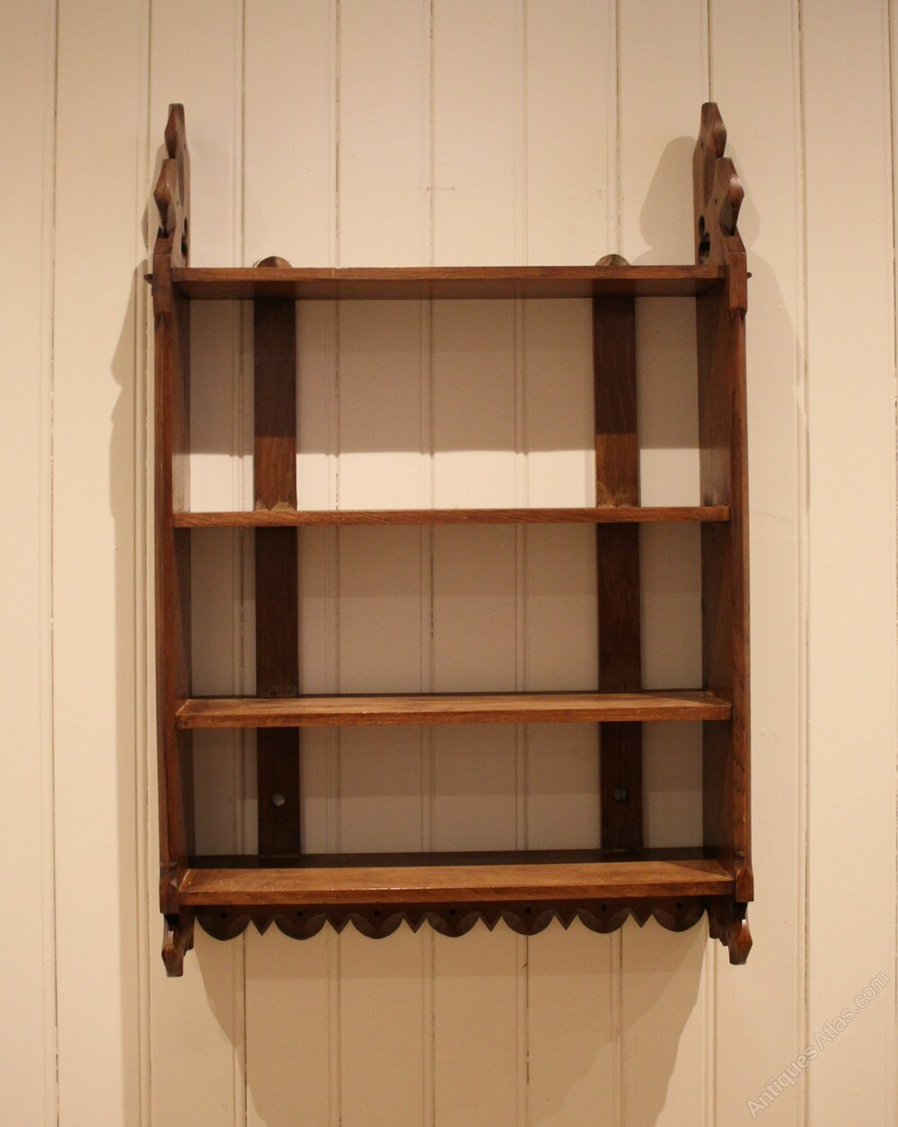 Victorian oak wall shelves having three fixed shelves with decorative shaped and pierced sides with a curved apron to the base.
