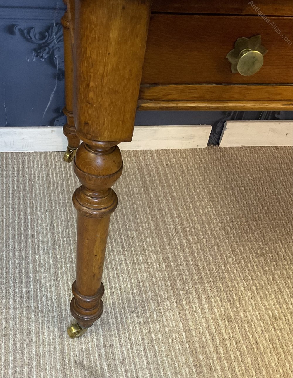 Good Victorian Oak Writing Table with inset Gilt tooled black leather writing surface and fitted with two drawers to the frieze, standing on turned legs and terminating in a brass castor