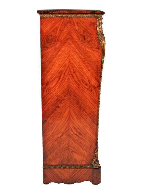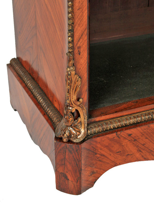 Circa 1860, Victorian ormolu mounted open bookcase. This French styled open bookcase has a rectangular top which is quarter veneered in kingwood and has a stylised shape to it. There is a moulded edge which is made in matching walnut. Below this is a shaped apron which has matching veneers and a chamfered edge which is crossbanded in rosewood. There are finely cast capitals coming from the fore edge and ormolu mounts below the top, which run around the gables as well. The gables are shaped and have matching veneers which are angled to each other. There are 2 adjustable shelves which are crossbanded and polished. At the bottom the ormolu mount continues around the front and sides, and the whole piece stands on a stylish shaped base.