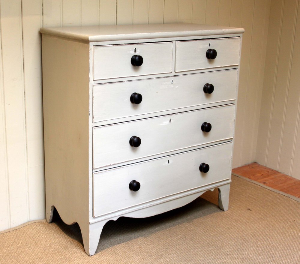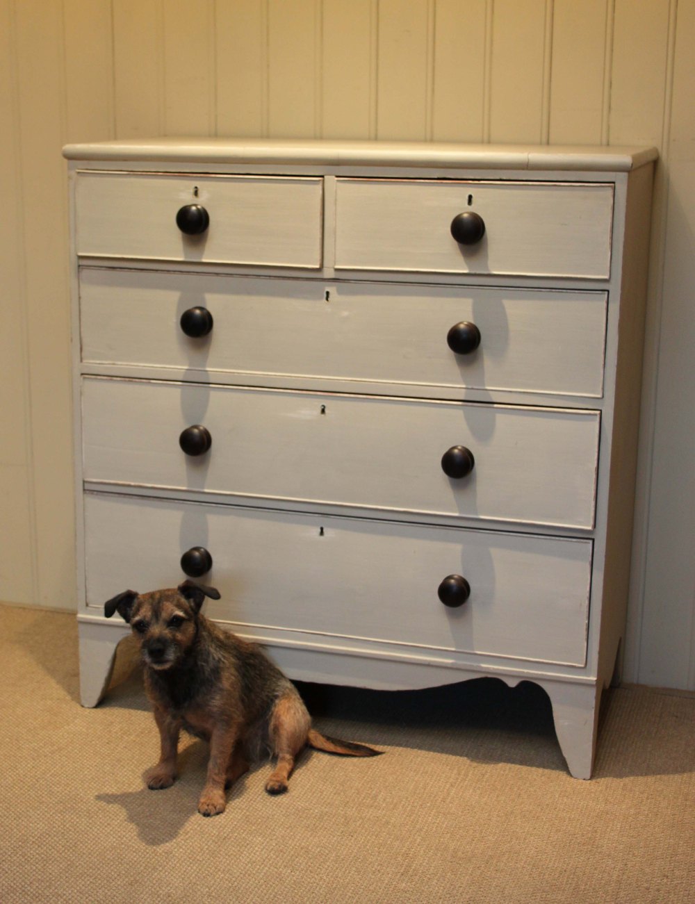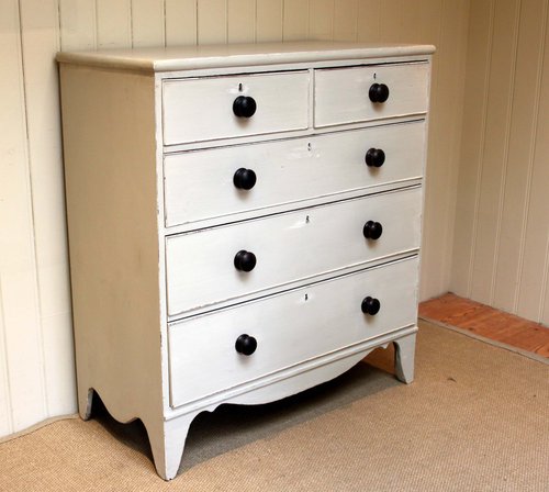 Victorian painted chest of two short and three long drawers with turned wooden handles raised on a shaped plinth base