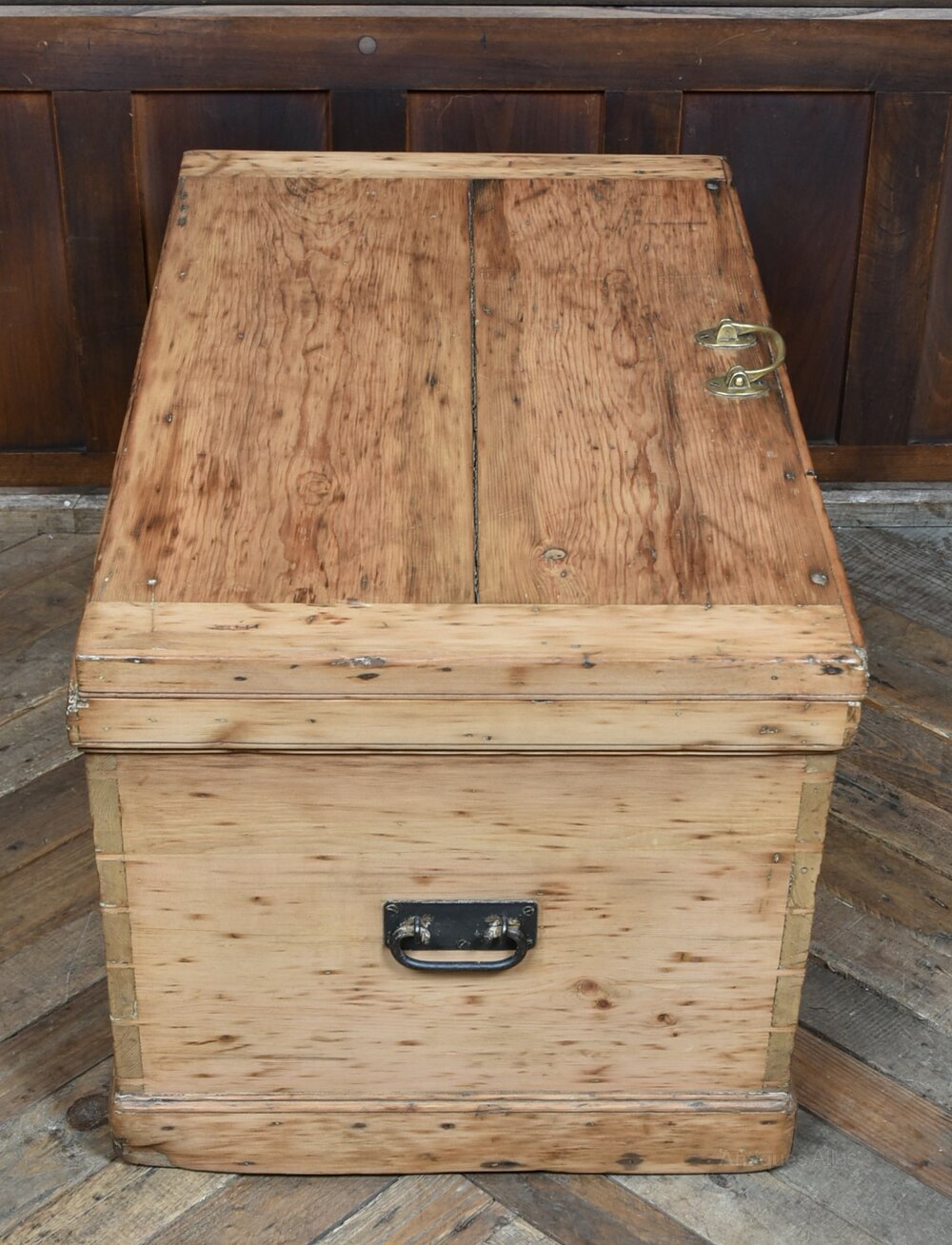A sturdy Victorian pine tool chest, featuring a hinged lid and original brass fittings. Crafted from pale, well-figured pine, the surface bears the honest marks of age—darkened patches and wear that reflect its working past. The lid is fitted with a central brass handle and opens to reveal an interior thoughtfully arranged with drawers. Two black iron carry handles are mounted to either side, adding both function and visual contrast. With its straightforward construction and richly patinated finish, this chest offers timeless character—perfect as a blanket box, coffee table, or decorative storage in a rustic or industrial setting.