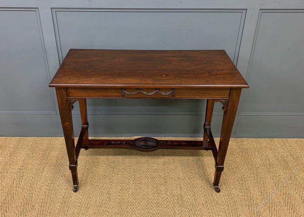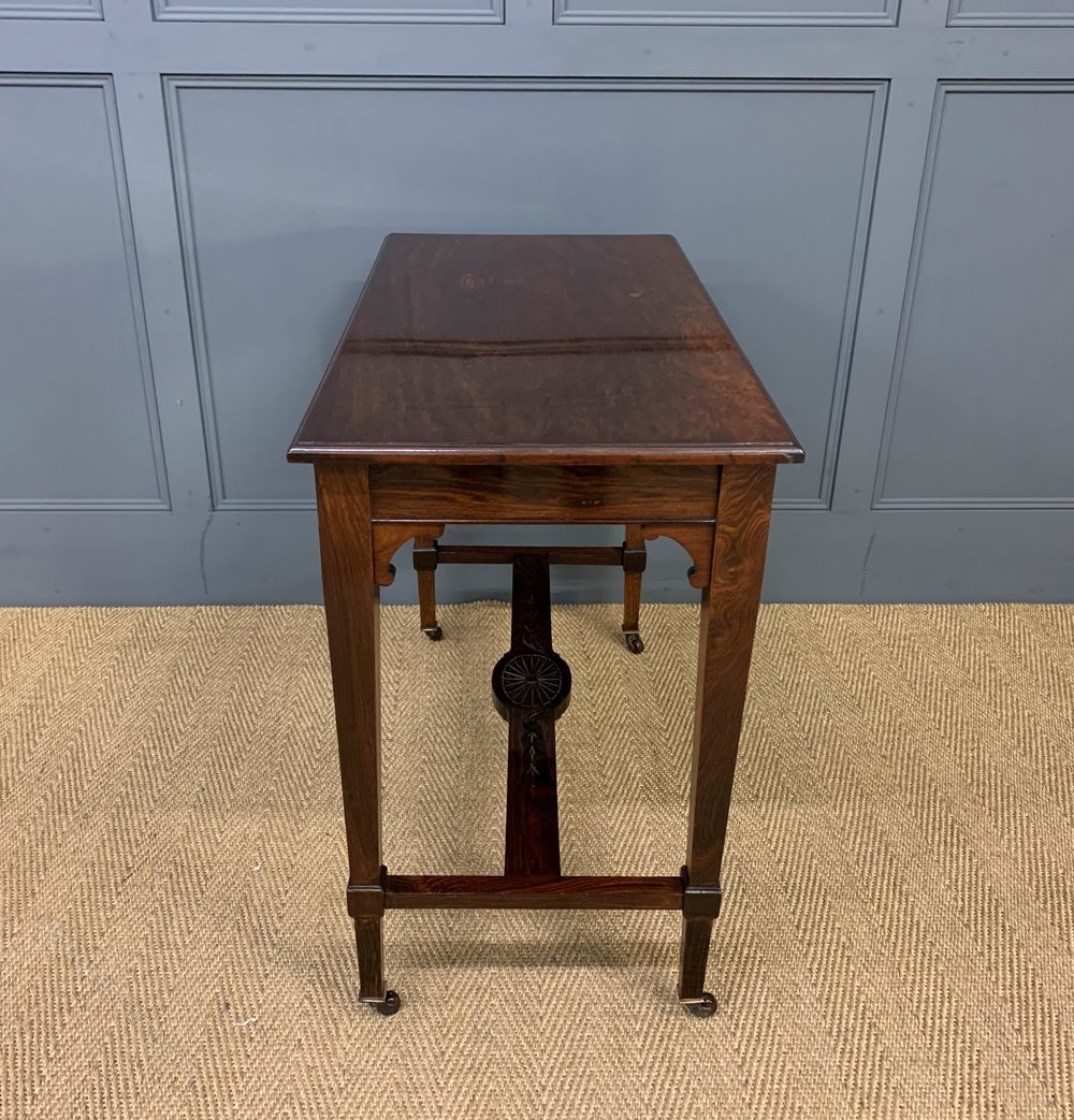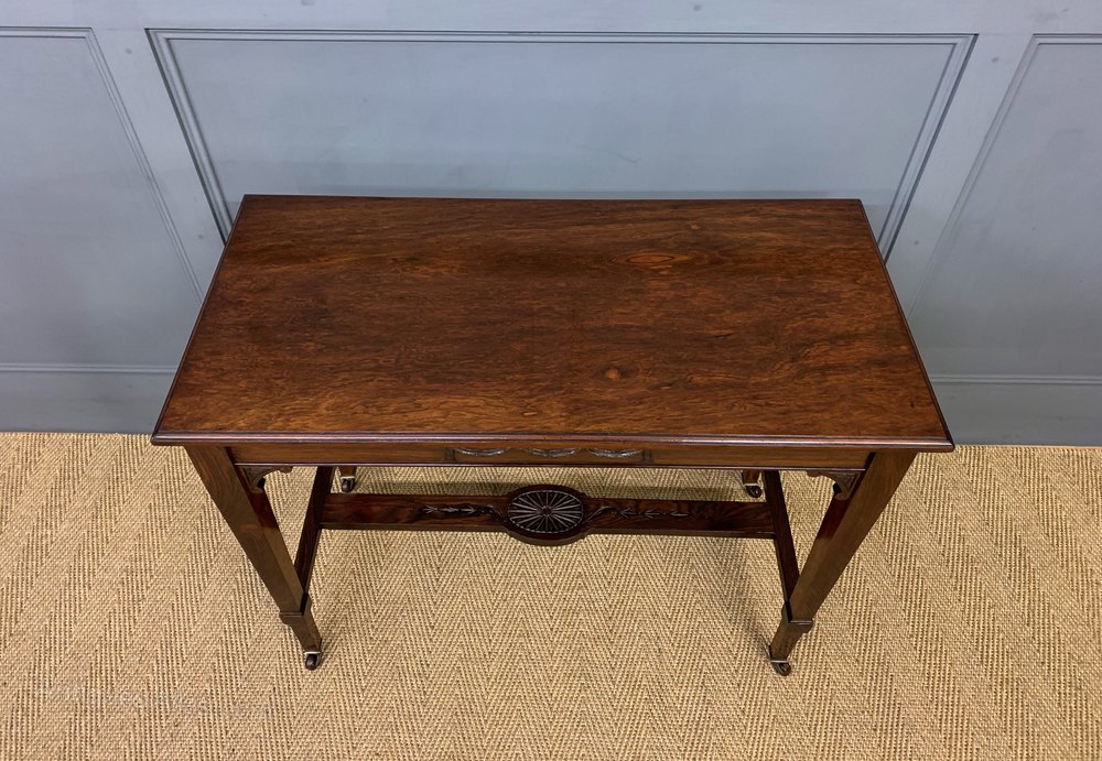 A fine late Victorian period lamp, or window, table by Samuel Hudson of London. Of fine construction in solid rosewood and attractive rosewood veneers onto a mahogany carcas. The rectangular top supported by square tapering legs , united by an under-tier. All standing on original castors. This charming table would sit well within many different room scenarios within the modern home. Finished to the rear so could be free-standing within a room if required. Sympathetically refinished in our workshops and now offered for sale in excellent condition, ready to go straight into the home.