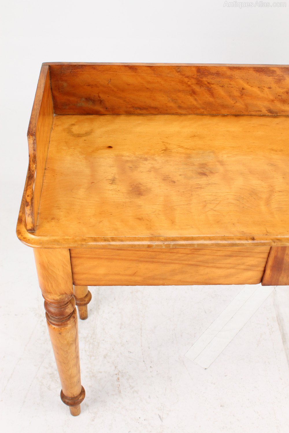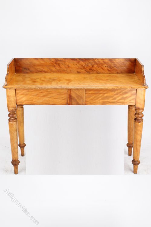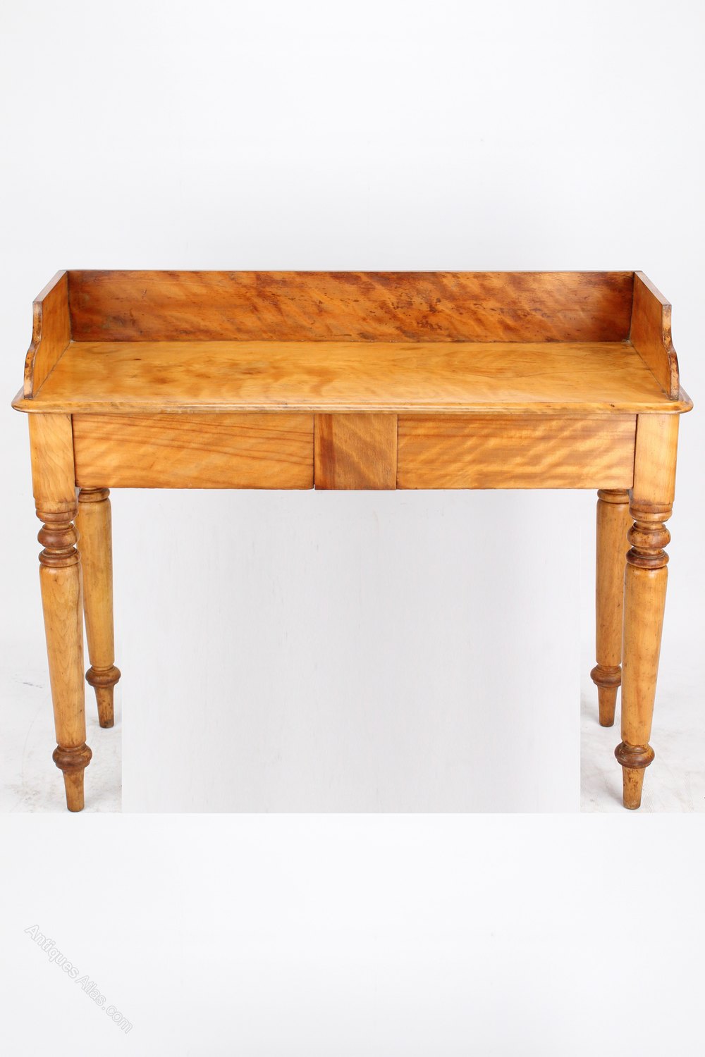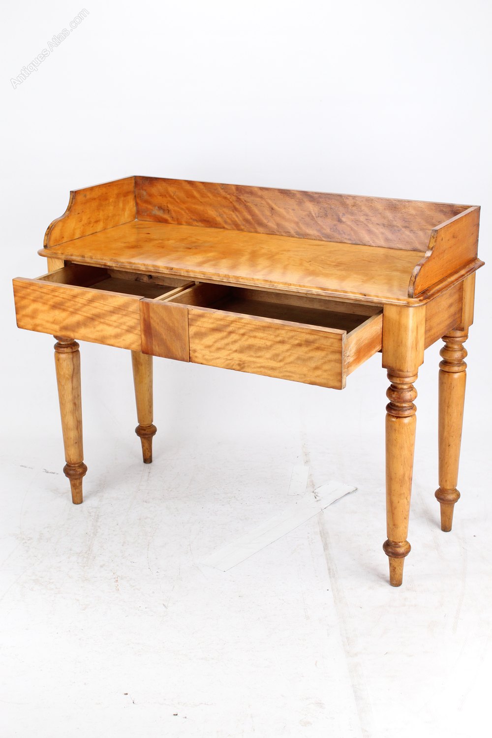 A good quality antique Victorian satinwood and pine writing table or desk with 2 drawers dating from circa 1870. Mellow and well-figured it stands on elegant turned legs and features a shaped gallery top above two capacious drawers. A well-proportioned piece, originally a washstand, it is a good size, offering lots of work space but not too deep. In good original condition with wear and marks to the top commensurate with age.