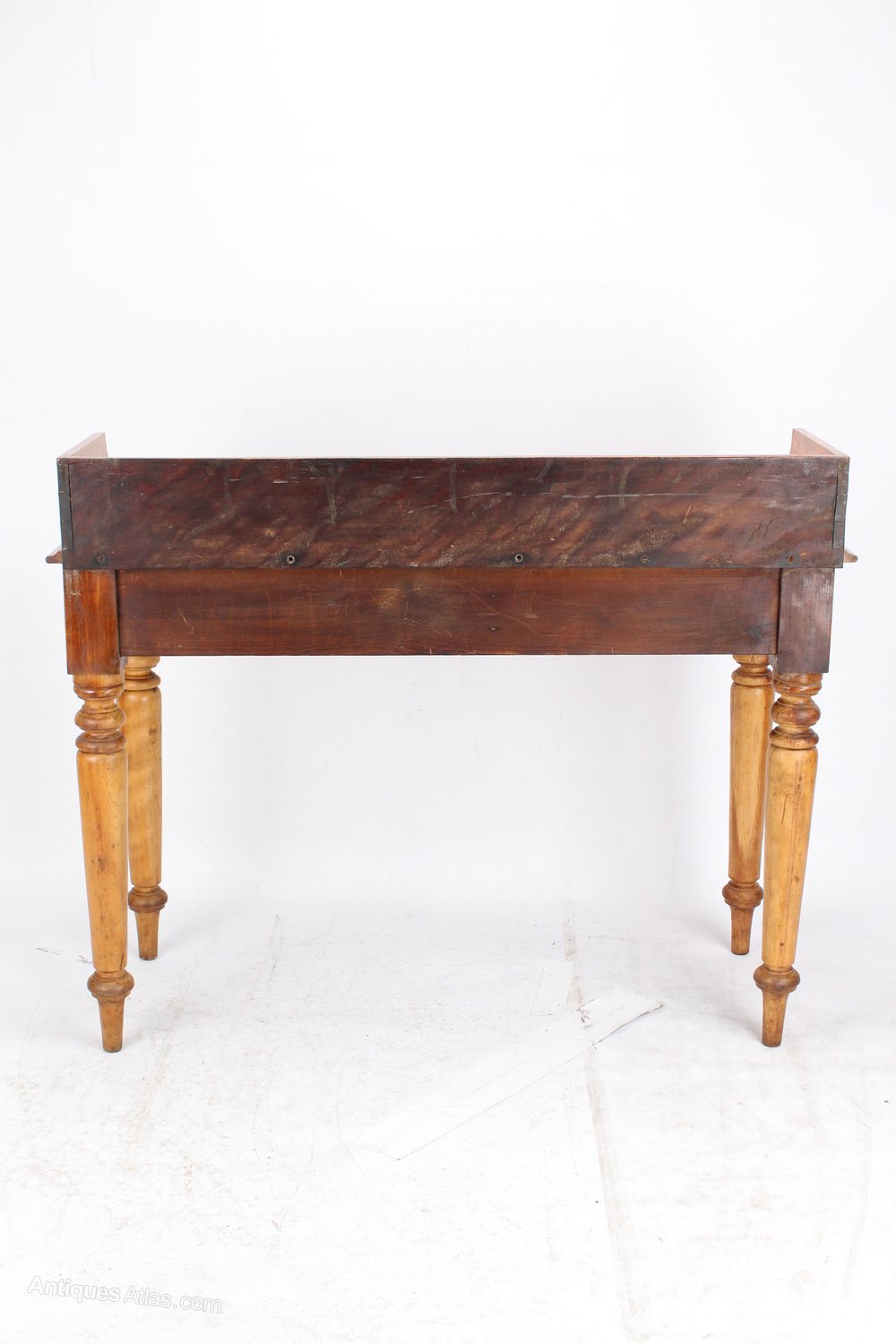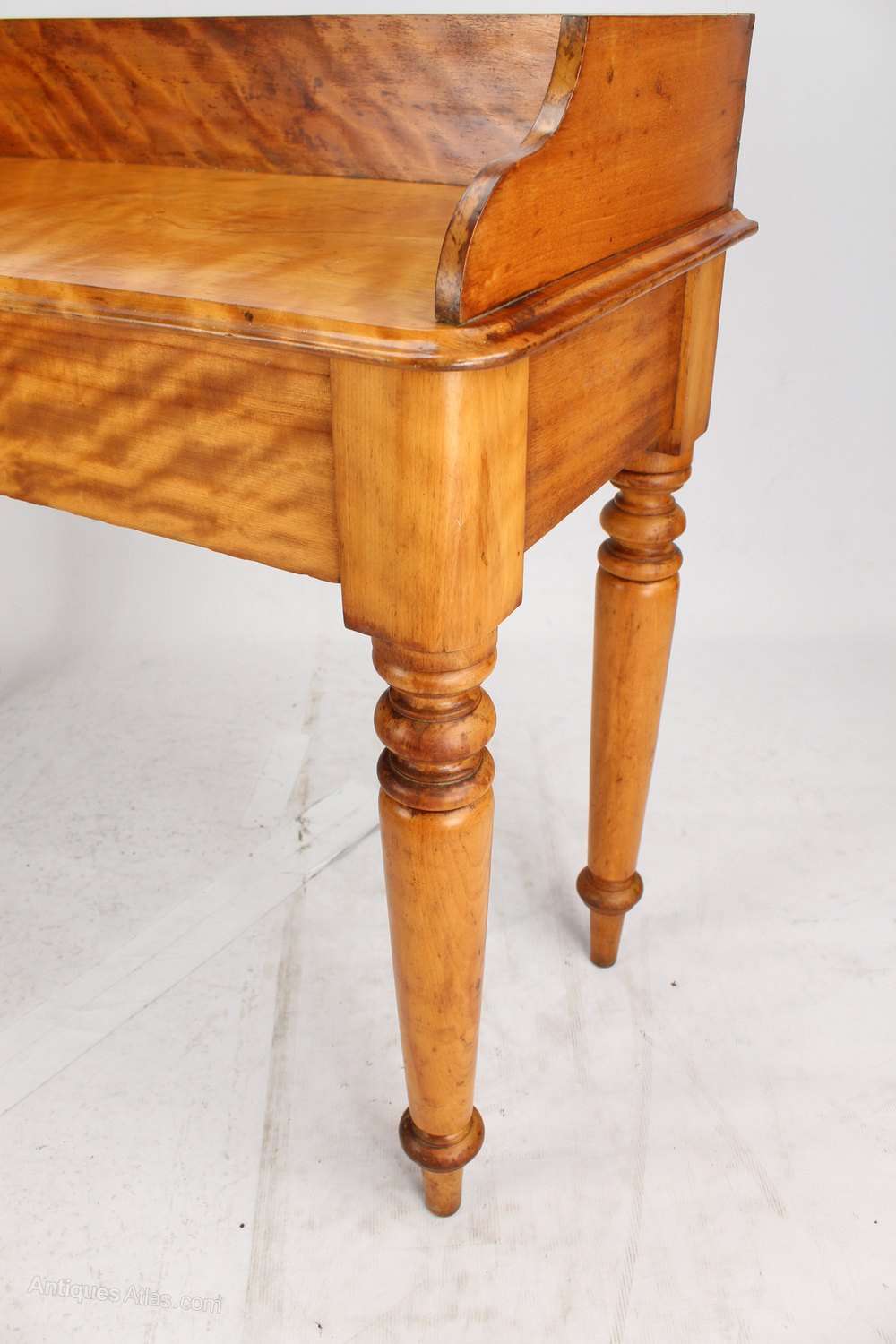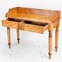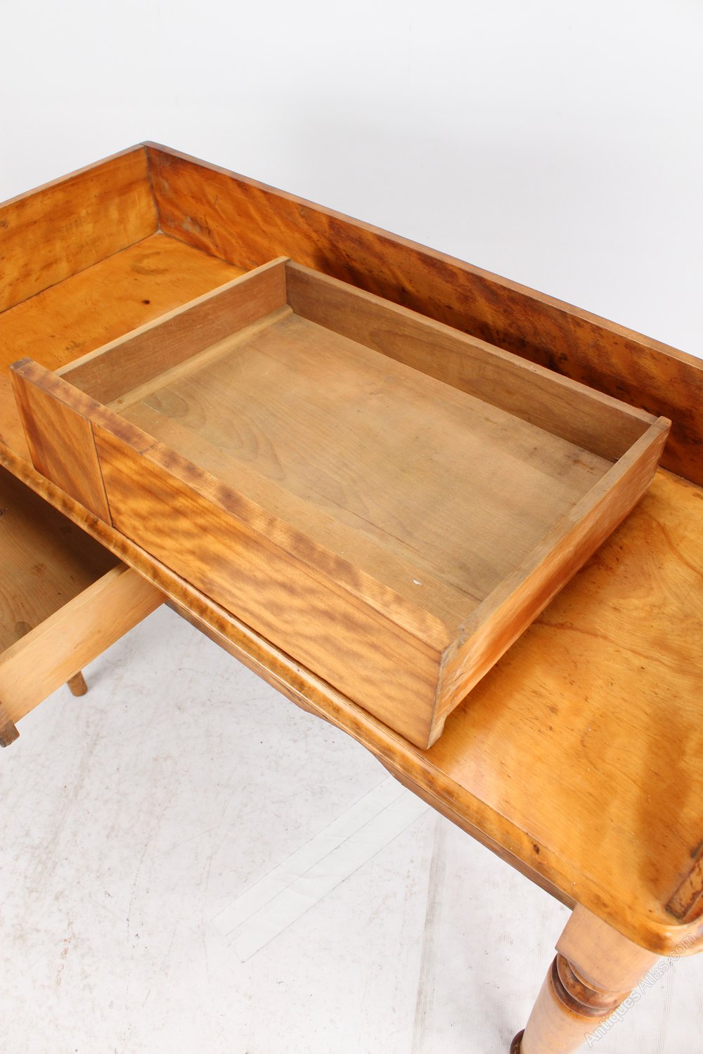 A good quality antique Victorian satinwood and pine writing table or desk with 2 drawers dating from circa 1870. Mellow and well-figured it stands on elegant turned legs and features a shaped gallery top above two capacious drawers. A well-proportioned piece, originally a washstand, it is a good size, offering lots of work space but not too deep. In good original condition with wear and marks to the top commensurate with age.