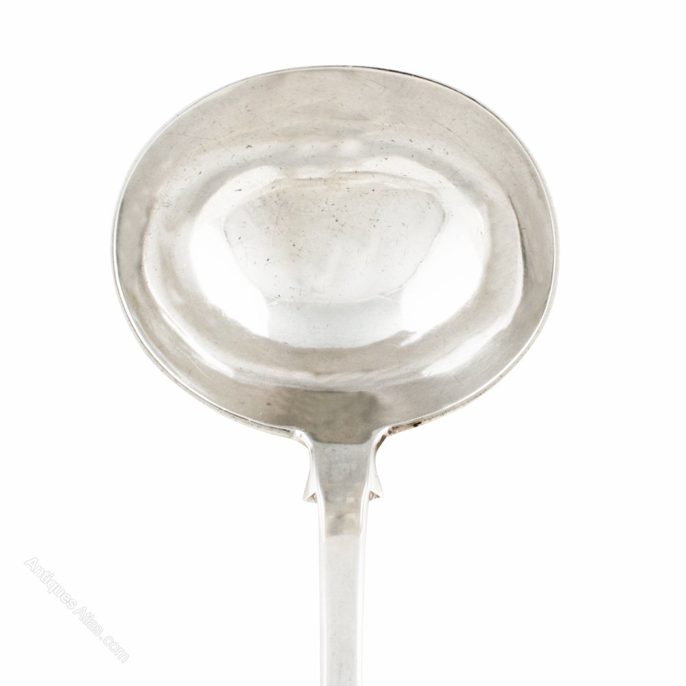The ladle has a long handle with a thread and shell pattern to the terminal.