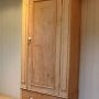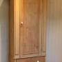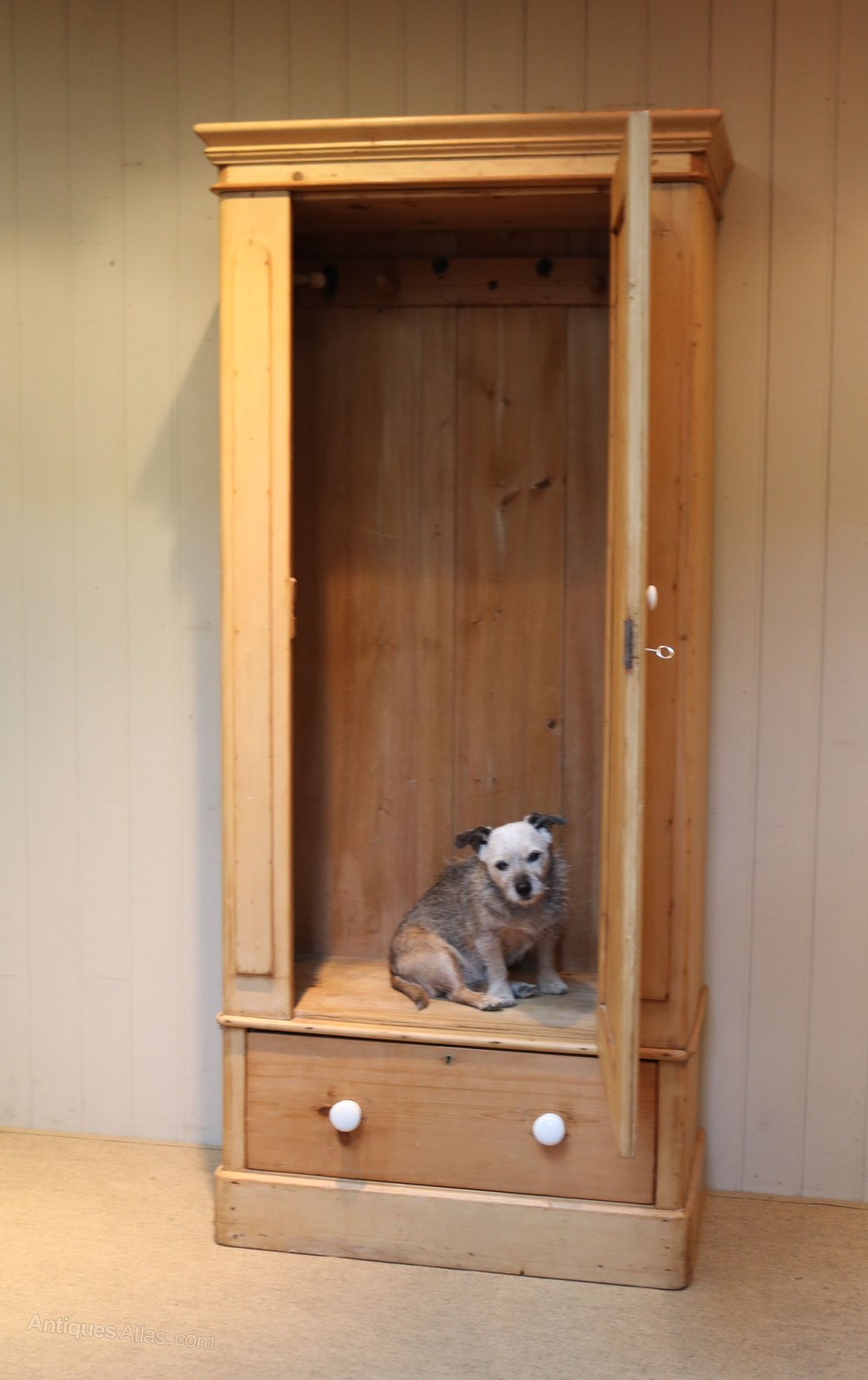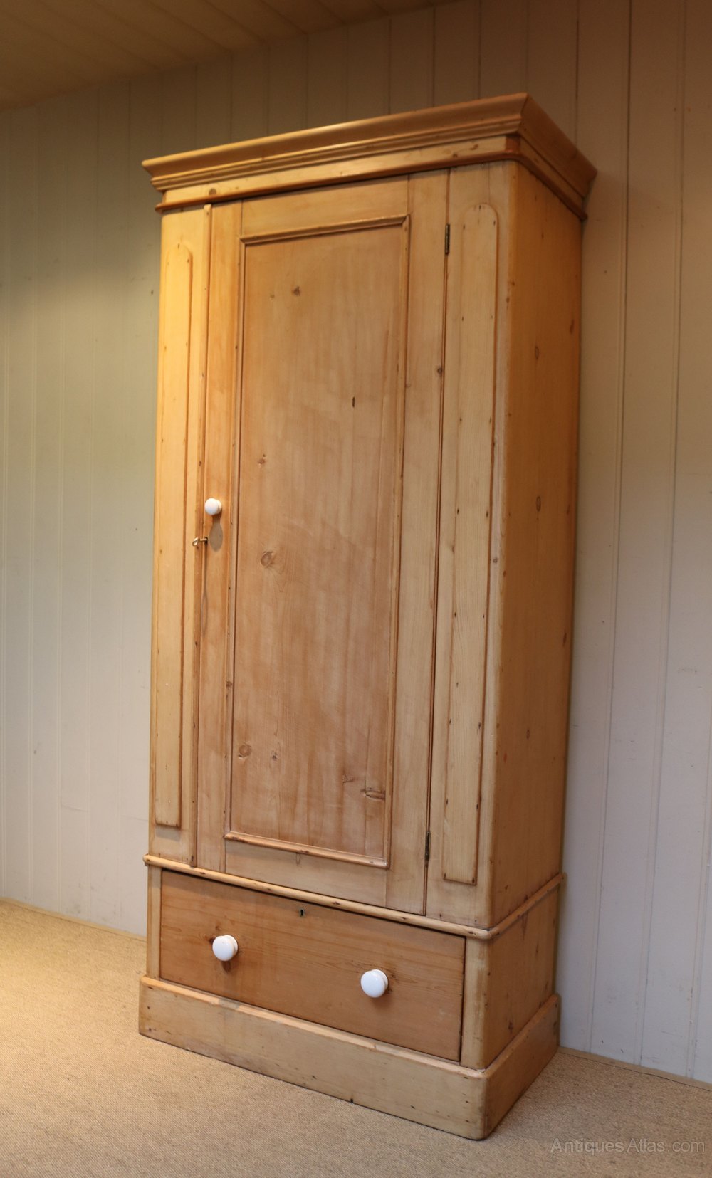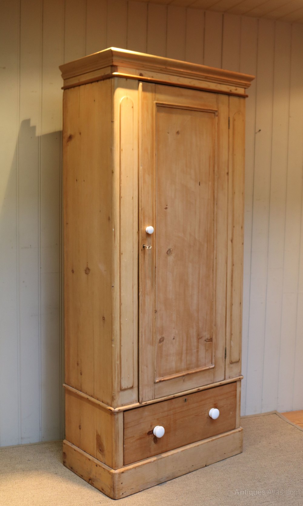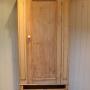 Single pine cupboard having panelled door opening to reveal an interior fitted with an arrangement of coathooks , above a base drawer with white ceramic handles, raised on a plinth base .The internal depth is 39cm