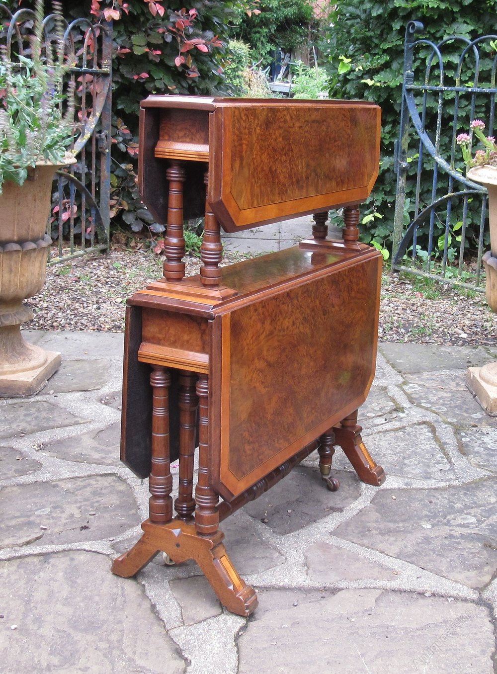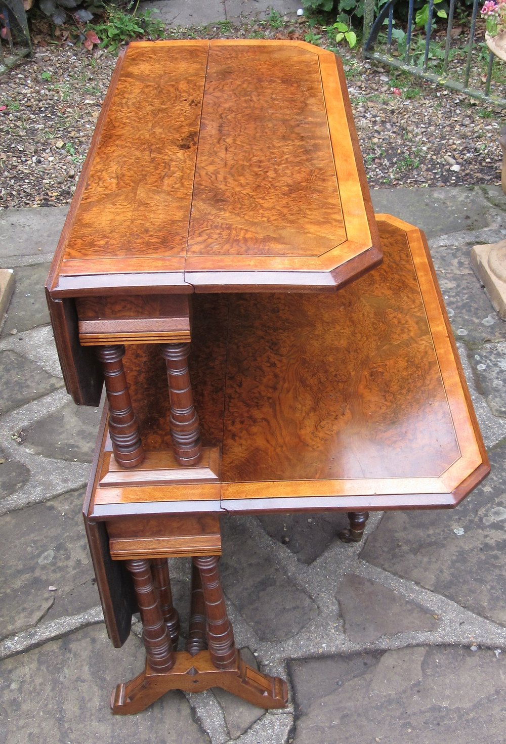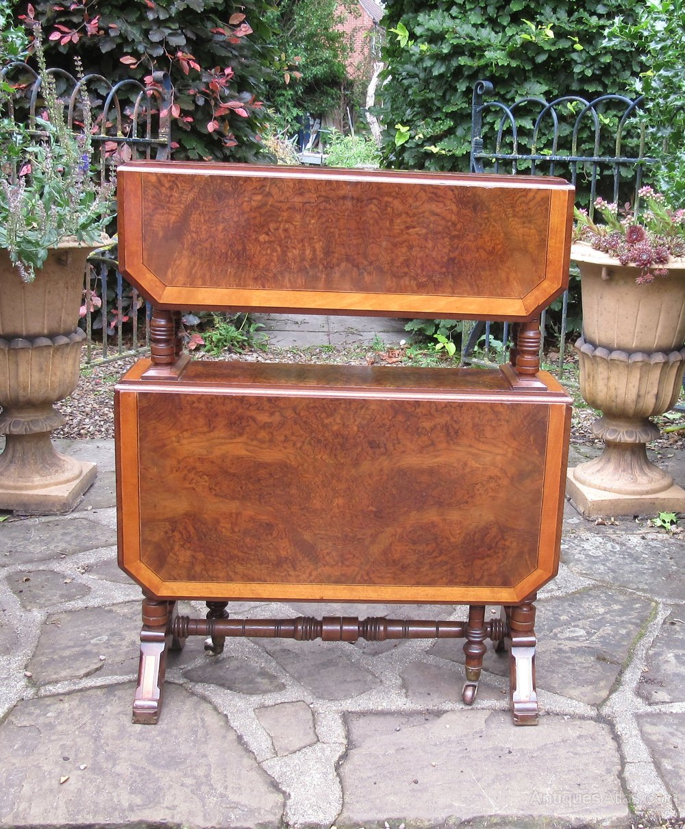 The Burr and Figured Walnut veneers have been expertly chosen and, as an added feature, the leaves have been cross-banded with Satinwood. They are a rich, deep golden colour and have a good patina.