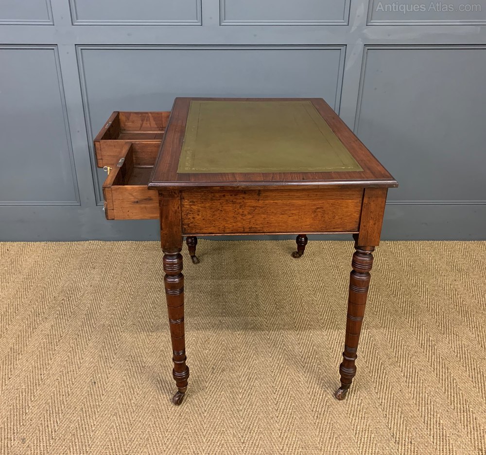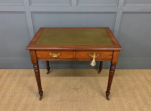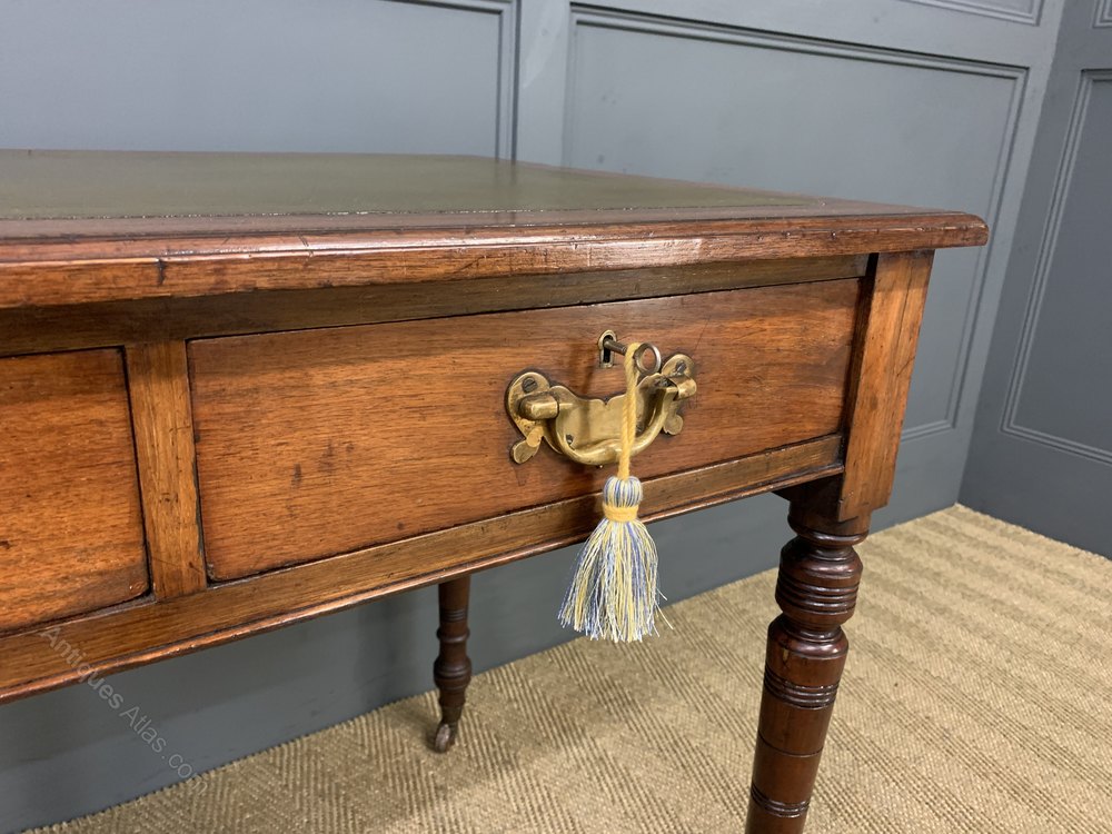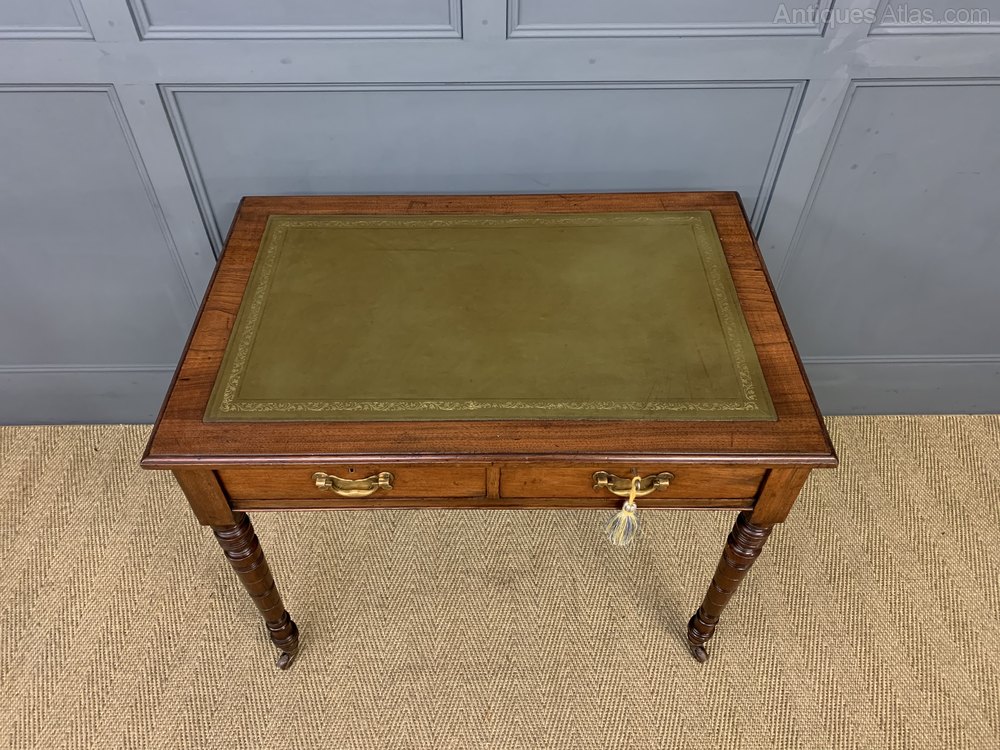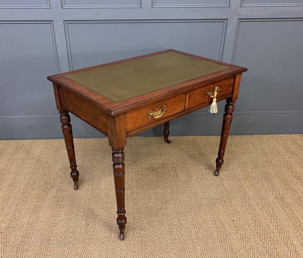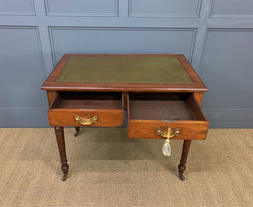 A late Victorian period 2 drawer writing table in walnut. Of very good construction in solid walnut with attractive walnut veneers. The top is fitted with a sumptuous green leather writing surface. To the freeze there are a pair of drawers (lockable with key supplied) , fitted with their original brass handles. Standing on elegant ring-turned legs which terminate in the original brass and ceramic castors. This table is finished to the rear so could be free standing within a room if desired. Sympathetically refinished in our workshops and now offered for sale in excellent condition, ready to go straight into the home or office.