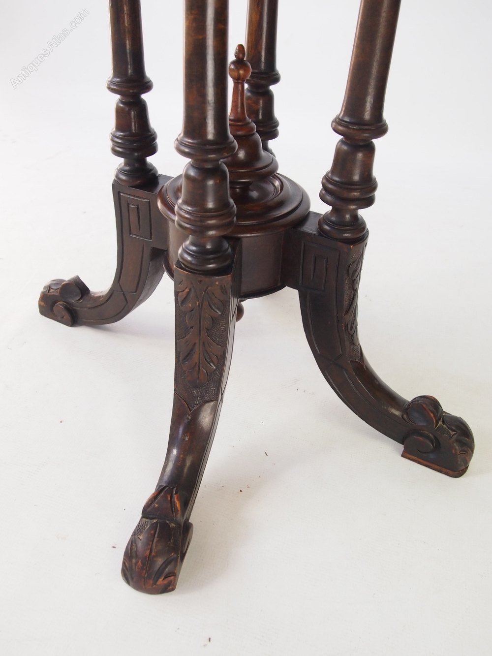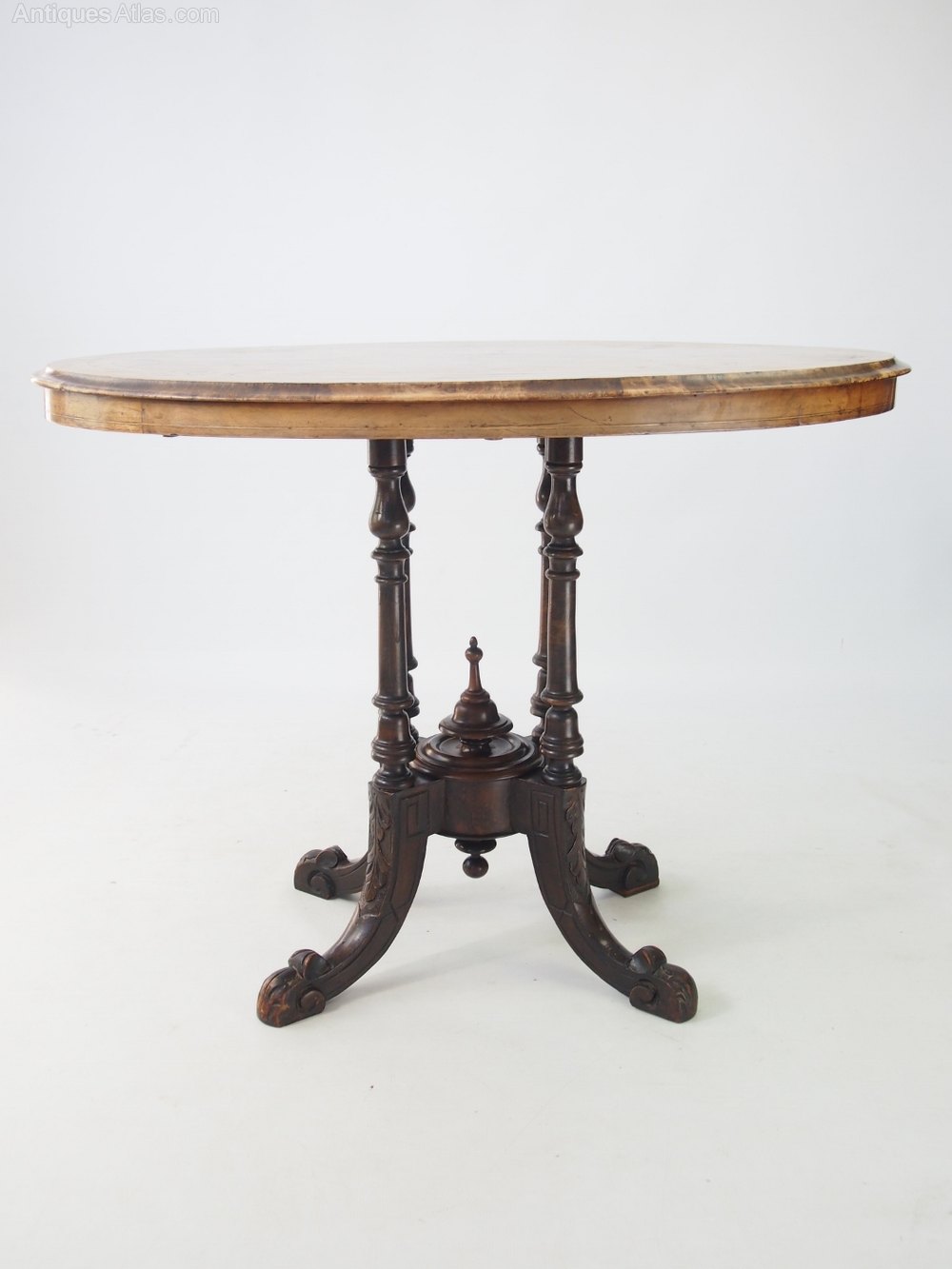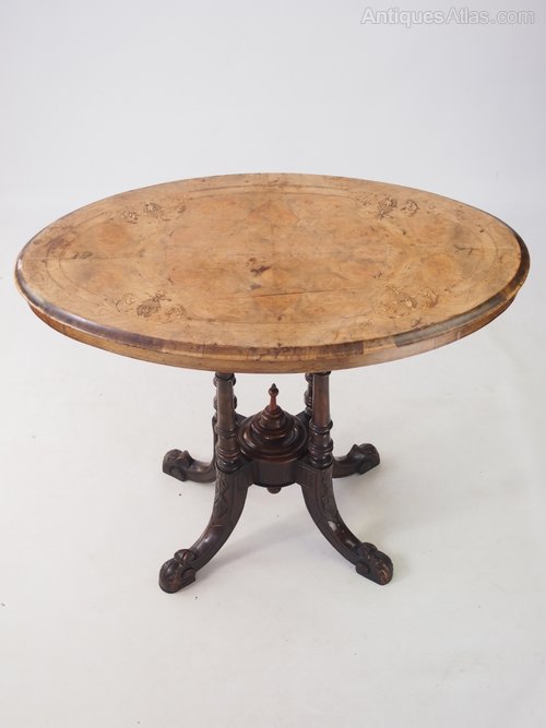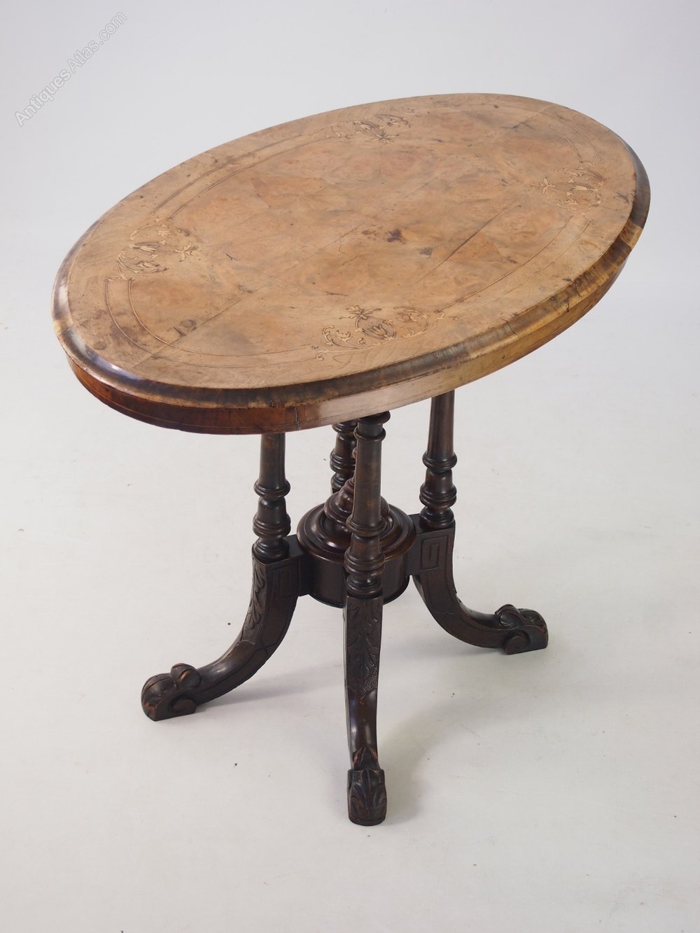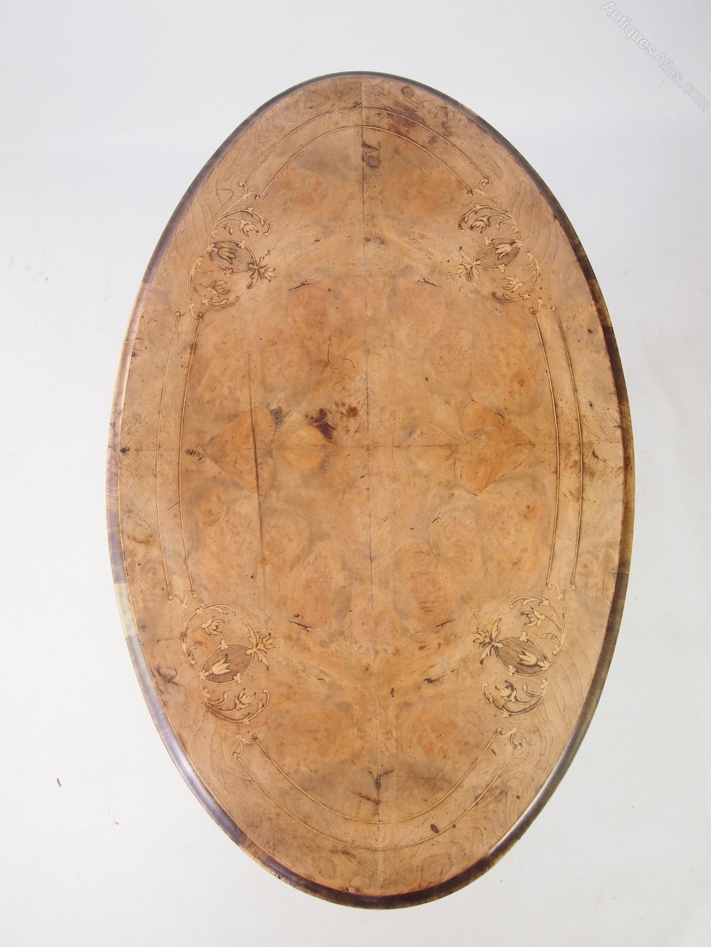 A charming small antique Victorian oval window table in Walnut with inlay of Boxwood to the top dating from circa 1880. The top supported by four turned supports and carved cabriole legs. The walnut is in a lovely mellow faded pale yellow and it is in good condition.