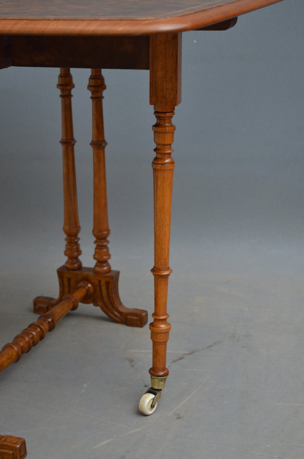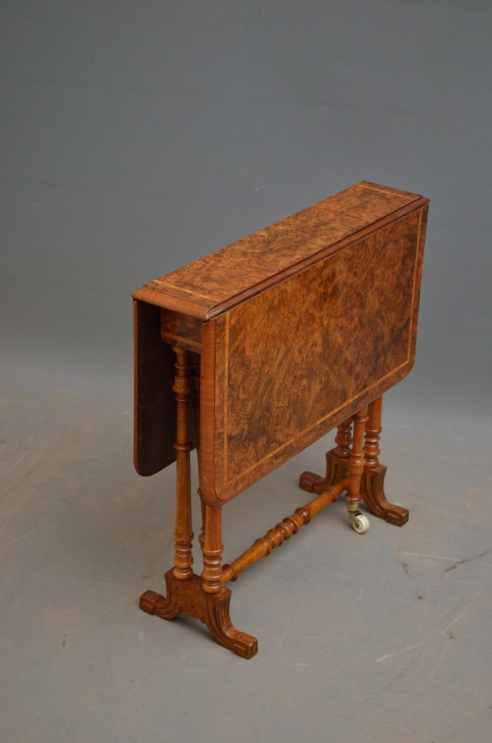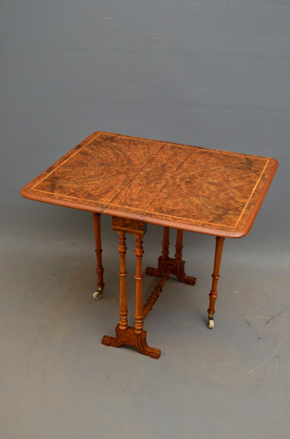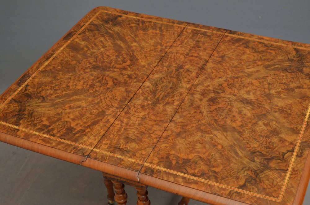 K0176 An attractive Victorian burr walnut Sutherland table, having stunning burr top with kingwood crossbanding and standing on slender turned legs terminating in carved feet and united by turned stretchers. This attractive drop leaf table / occasional table retains its original finish colour and patina, all in wonderful condition throughout, ready to place at home. c1880