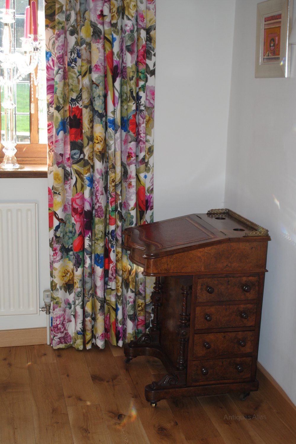 This is a lovely late Victorian serpentine-fronted walnut Davenport desk. It has 4 drawers, 4 dummy drawers and a writing slope, with brass rail above. Inside it is fitted out with satinwood drawers. Sensitively restored, it is now a stunning and useful piece of antique furniture.