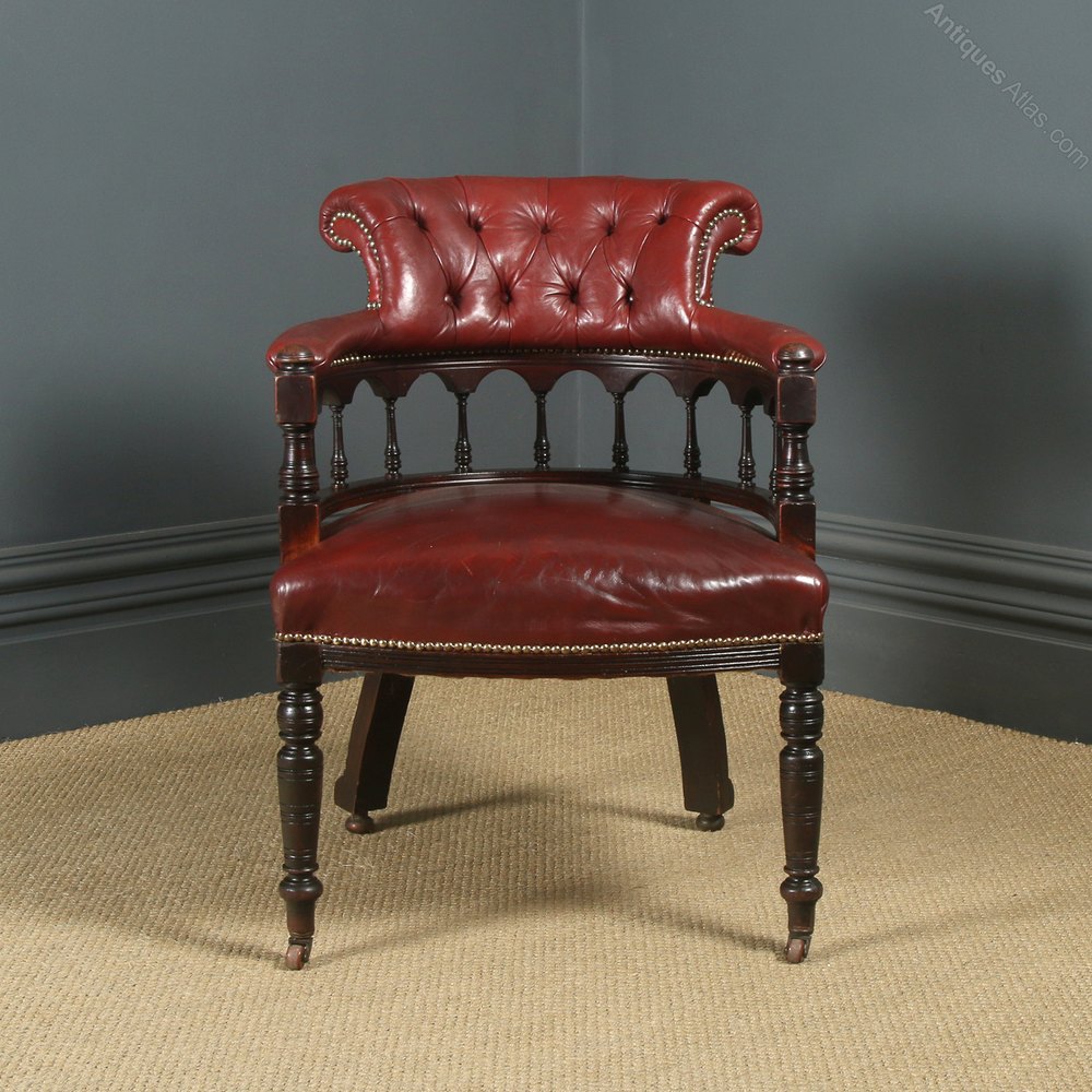 This in an attractive antique English Victorian walnut office chair, upholstered in burgundy red leather, circa 1880, in good condition. The Victorian walnut office chair is designed with an elegant curved, buttoned & padded leather backrest, above a single tier of finely turned spindles, flanked by spandrels, united by two reeded frames. The frame curves round to form wraparound arms, supported by larger decorative etched spindle supports at the front of each arm. The Victorian walnut office chair has been upholstered at some point in the past with a burgundy red leather, finished with hand-tacked brass studs to the perimeter. The stuff-over sprung seat is comfortable to sit on and is decorated with brass studwork to its perimeter on a moulded bow front rail, flanked by symmetrical scribe carvings to the frieze. The Victorian walnut office chair stands on sturdy ring turned legs to the front, with splayed block legs to the rear, terminating on its original castors on the front legs, with wooden button pads to the rear.