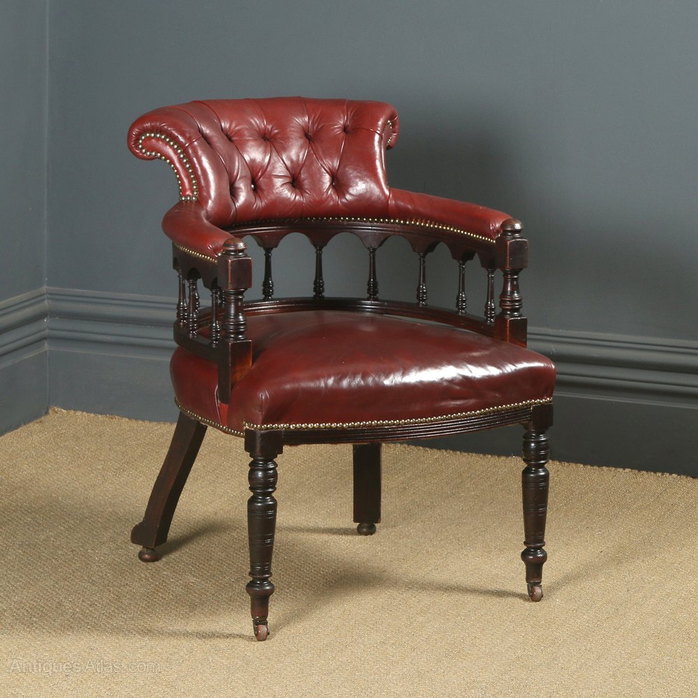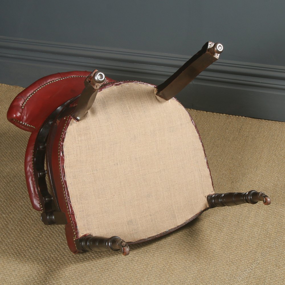 Condition This in an attractive antique English Victorian walnut office chair, upholstered in burgundy red leather, circa 1880, in good condition. Nominal old use marks to the leading edges of the chair frame. There has been old repair to the back right-hand corner of the outside arm frame which is solid in joint. The Victorian walnut office chair has been upholstered at some point in the past with a burgundy red leather, finished with hand-tacked brass studs to the perimeter. The leather is in good overall condition, with nominal old use marks to the seat but nothing significant, given the age of the leather. The sprung seat is supportive. As the chair boasts the original polish, it has a fantastic colour and patination this can only be achieved through age and years of care and cleaning it has received. The chair sits on its original castors to the front legs. This Victorian walnut office chair is well constructed, solid in joint and ready to use.