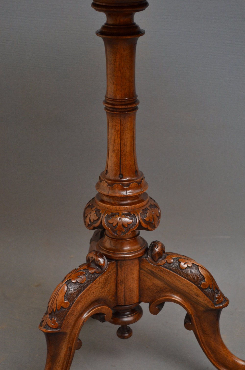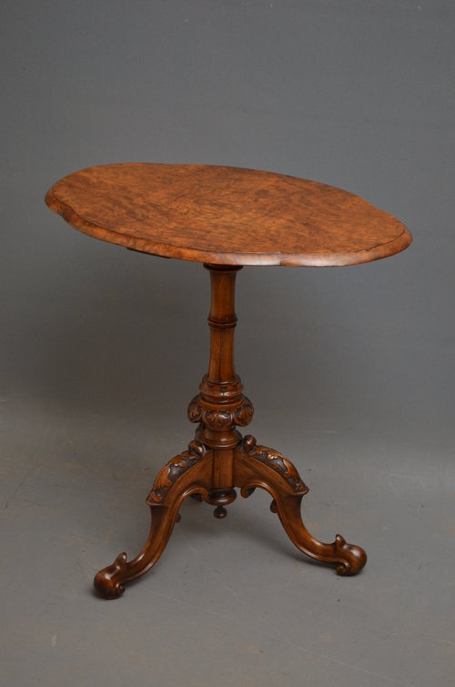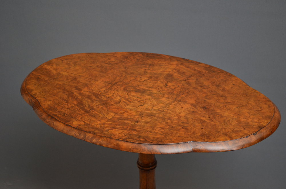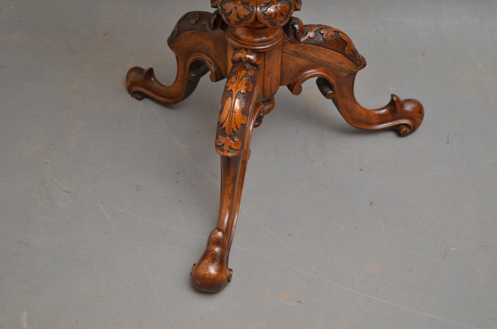 Sn043 An attractive Victorian, walnut, pedestal, occasional table, having shaped burr walnut top with moulded edge, standing on carved column terminating in 3 finely carved feet. c1860