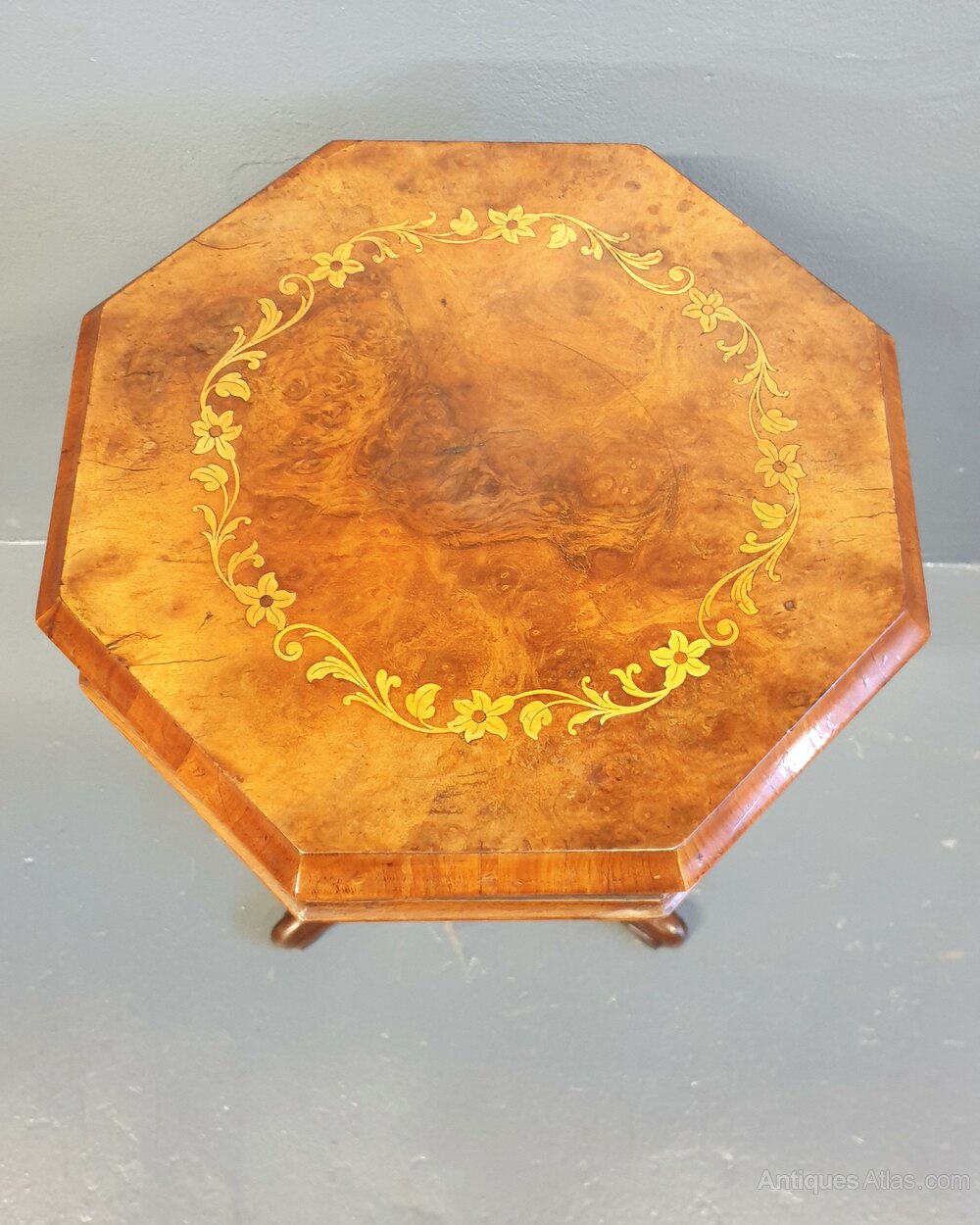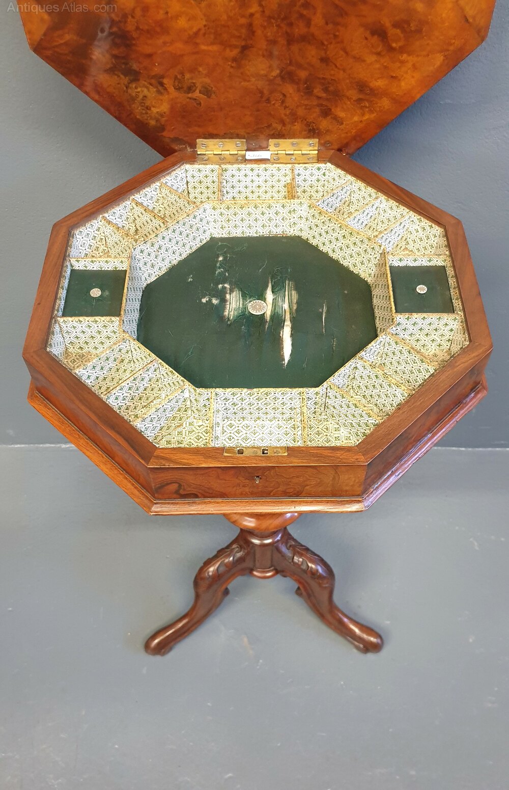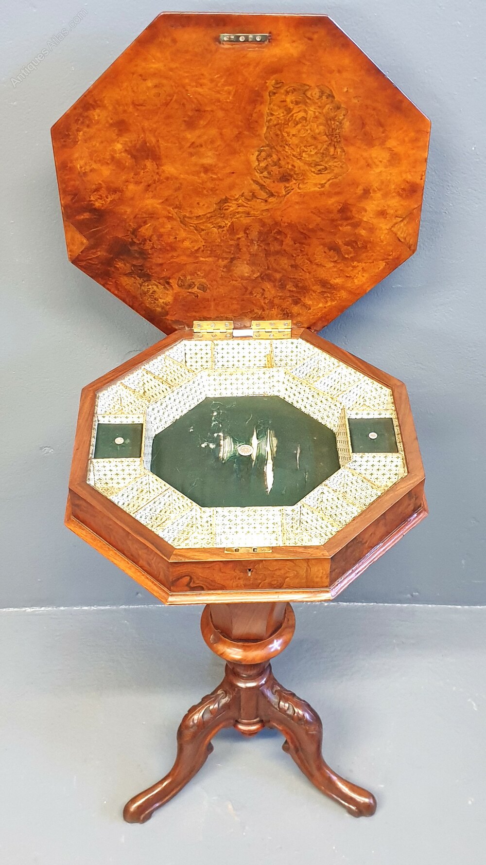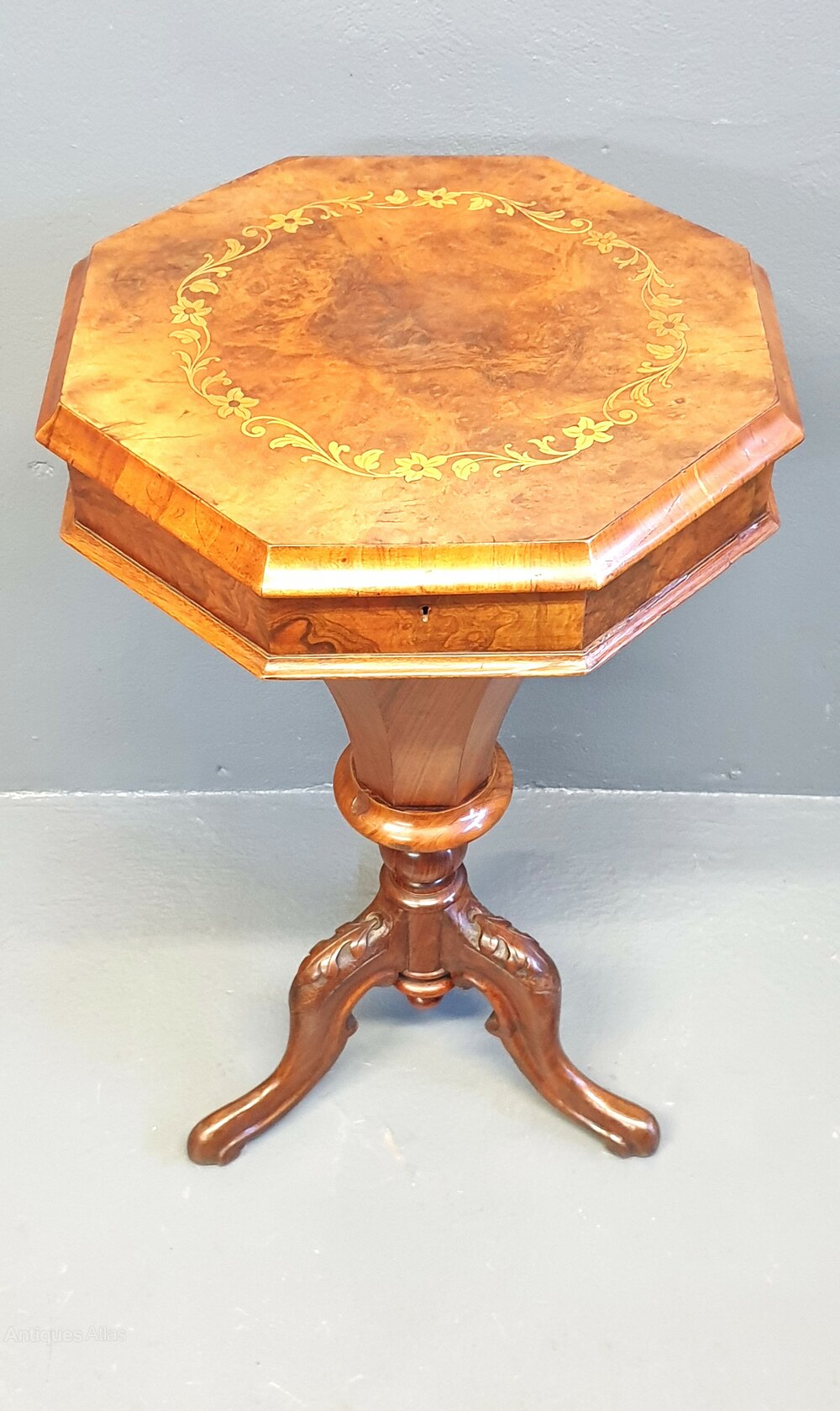 A Stunning Victorian Walnut & Inlaid Trumpet Shape Sewing Table Having an Octagon Top Opening To Reveal Compartments for sewing Spools, Needles Ect.