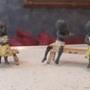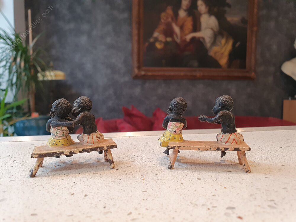 A pair of Vienna Bronze groups, with two couples in differing poses sitting on benches.