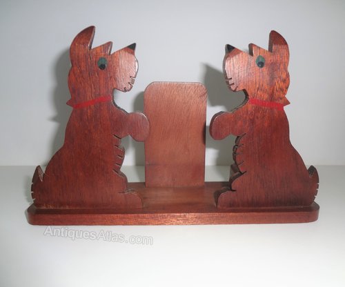 Very sweet vintage art deco Scottie dog wooden letter rack desk stand c 1930 made from solid hardwood with a lovely cheeky pair of fret work chip carved scottie terrier dogs both with painted googly eyes,nose,red collars