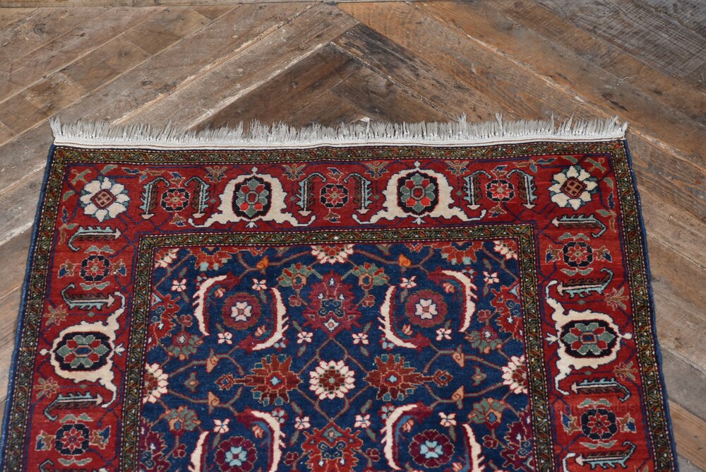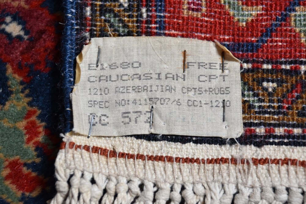 A striking Azerbaijani rug showcasing the region’s renowned craftsmanship and vibrant design tradition. The central field is rendered in deep indigo, adorned with symmetrical floral and geometric motifs in rich tones of red, white, and green. These intricate patterns are framed by a bold red border featuring repeating stylised elements, lending the piece a strong visual rhythm. Handwoven using traditional techniques, the rug is finished with fringed ends and displays a harmonious balance of colour and form. Its palette and patterning suggest origins in the Kazakh or Shirvan weaving traditions, known for their bold contrasts and symbolic motifs. This rug would make a stunning floor piece or wall hanging, offering both decorative appeal and cultural depth.