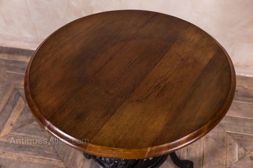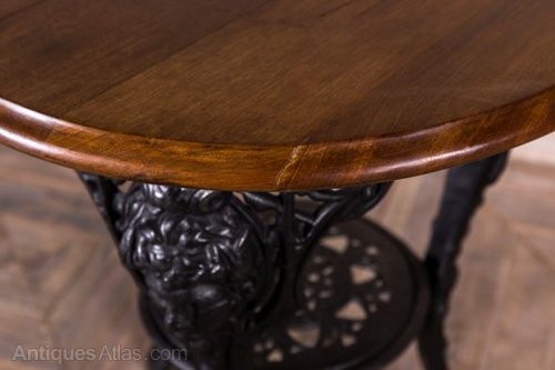 This is a lovely piece of original vintage antique furniture, featuring a heavy, ornate cast iron base and a solid mahogany top.