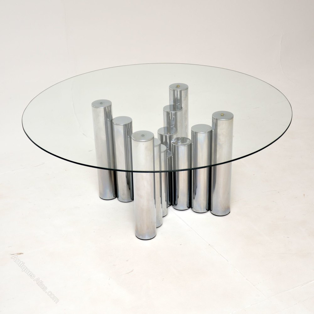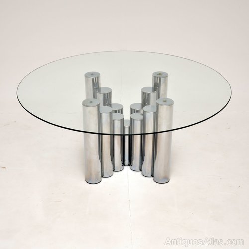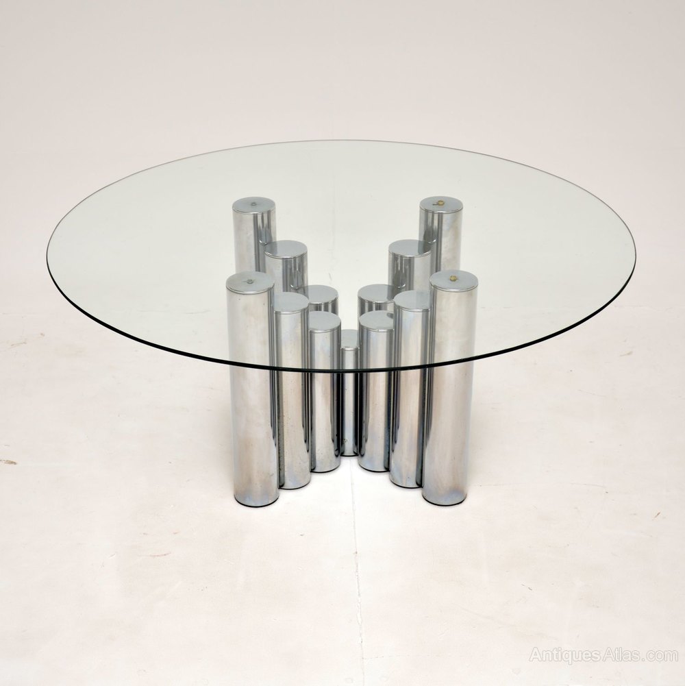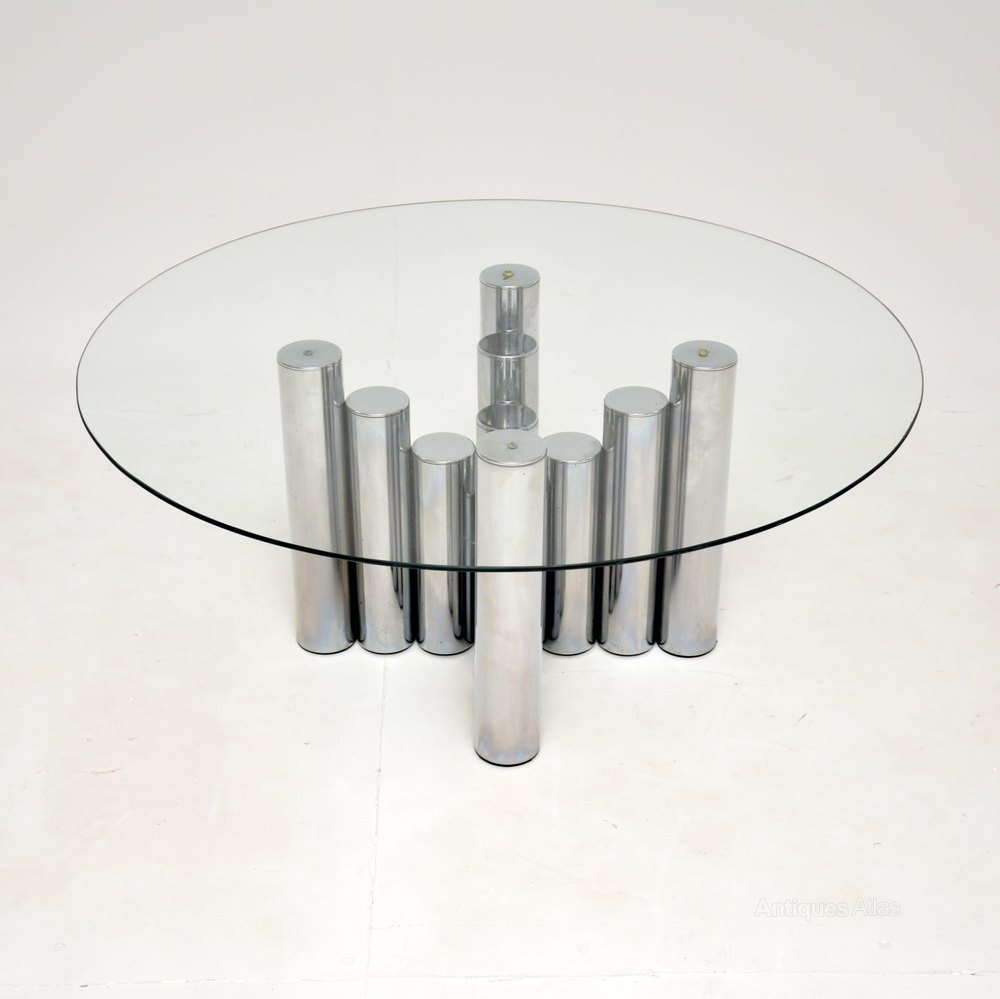 The base has a beautiful stepped design, made from tubular chromed steel. The circular glass top is toughened and overhangs the base to make this an impressive size.
