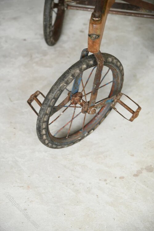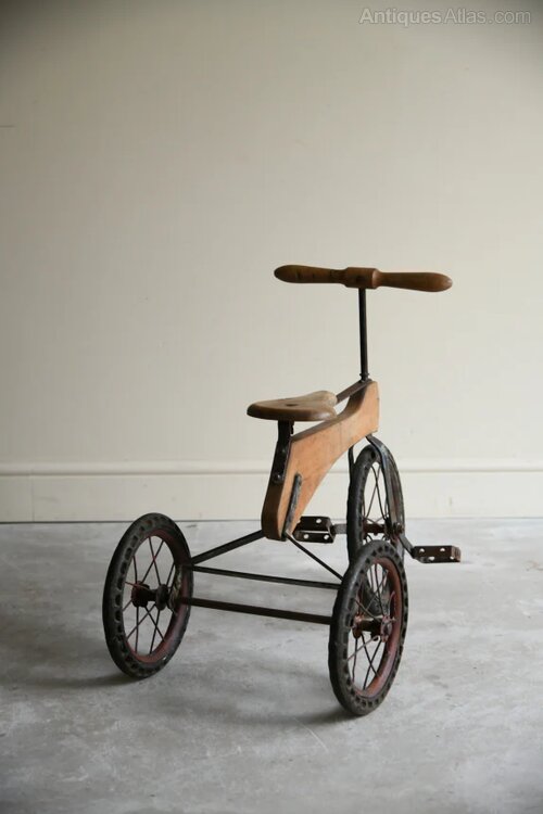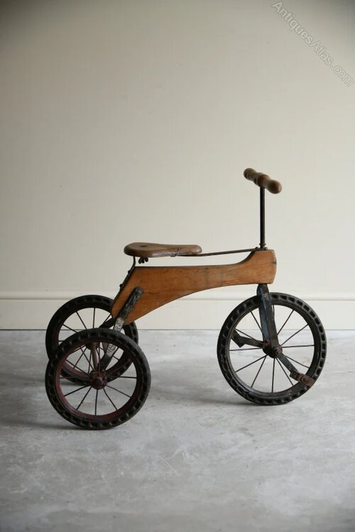 Vintage French Childs Tricycle. Early 20th Century childs tricycle with wooden seat and handle bars on solid rubber wheels, HDF badge to the front