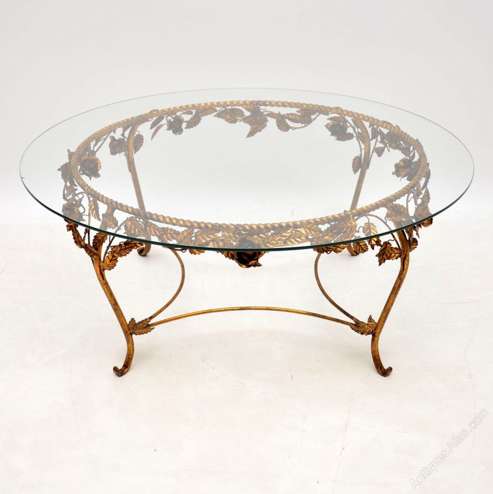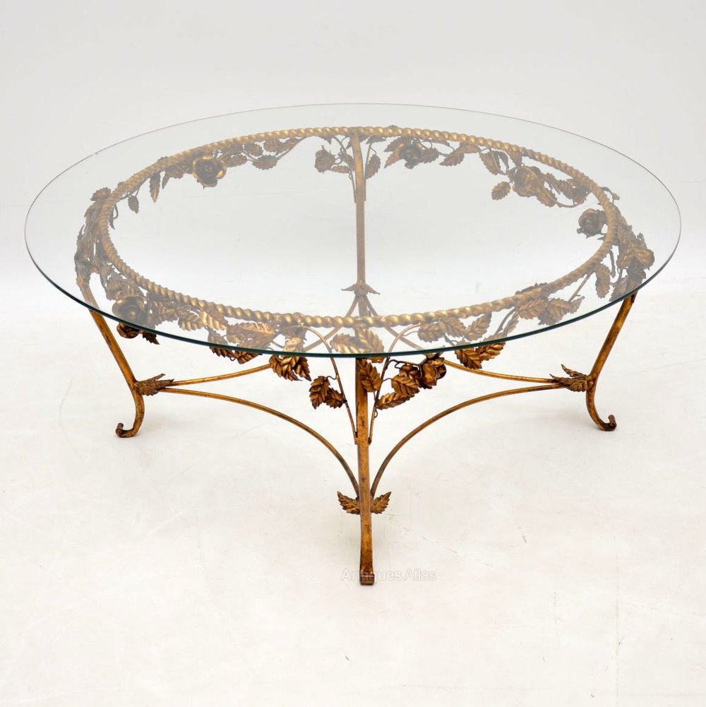 A stunning vintage coffee table made in France, this dates from around the 1950-60’s. It is of superb quality, with a beautiful gilt metal frame in a floral design. The circular toughened glass top has been newly made in the exact same size as the original, so it’s in perfect condition. The frame has only some minor surface wear and a lovely patina, it’s also in great condition.
