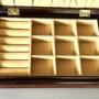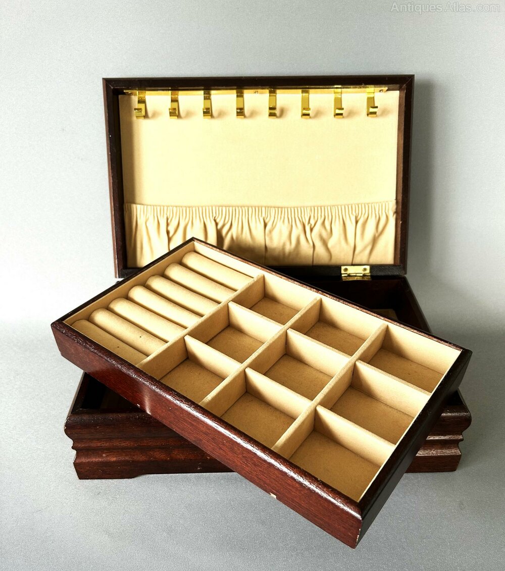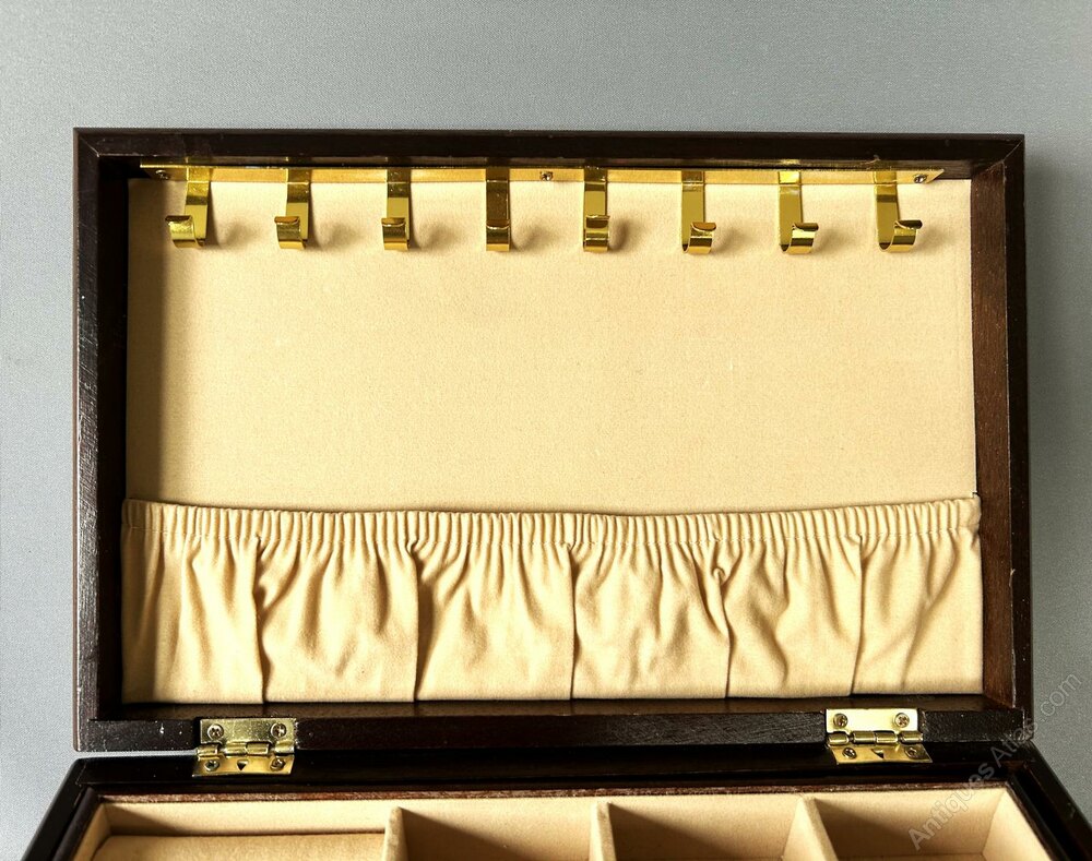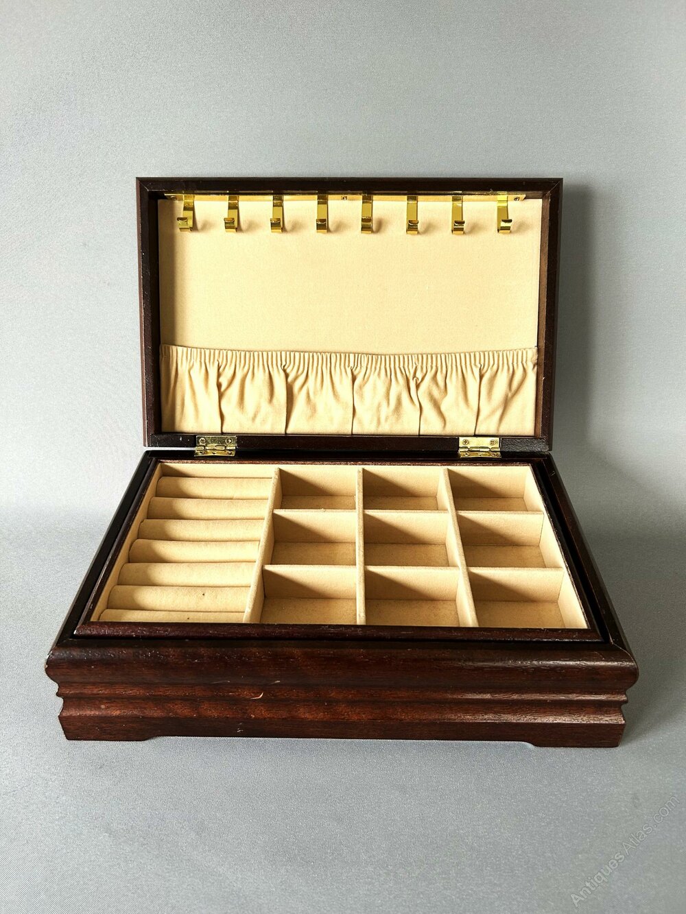 A good sized vintage jewellery box. This classic design box has a hinged lid, which opens to reveal a faux suede interior. Inside the lid is a row of hooks for necklaces and bracelets. The removable inner tray is divided into nine compartments suitable for small items and a padded area in rows for rings. The inner tray can be removed and there is a large storage area in the base, for larger items. The lid has a gilt inlay. A large and practical piece.