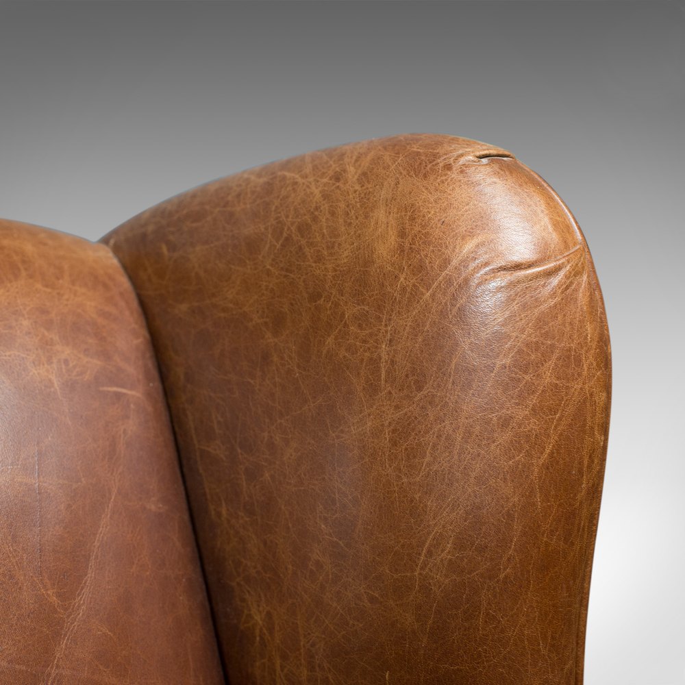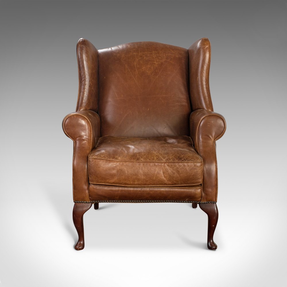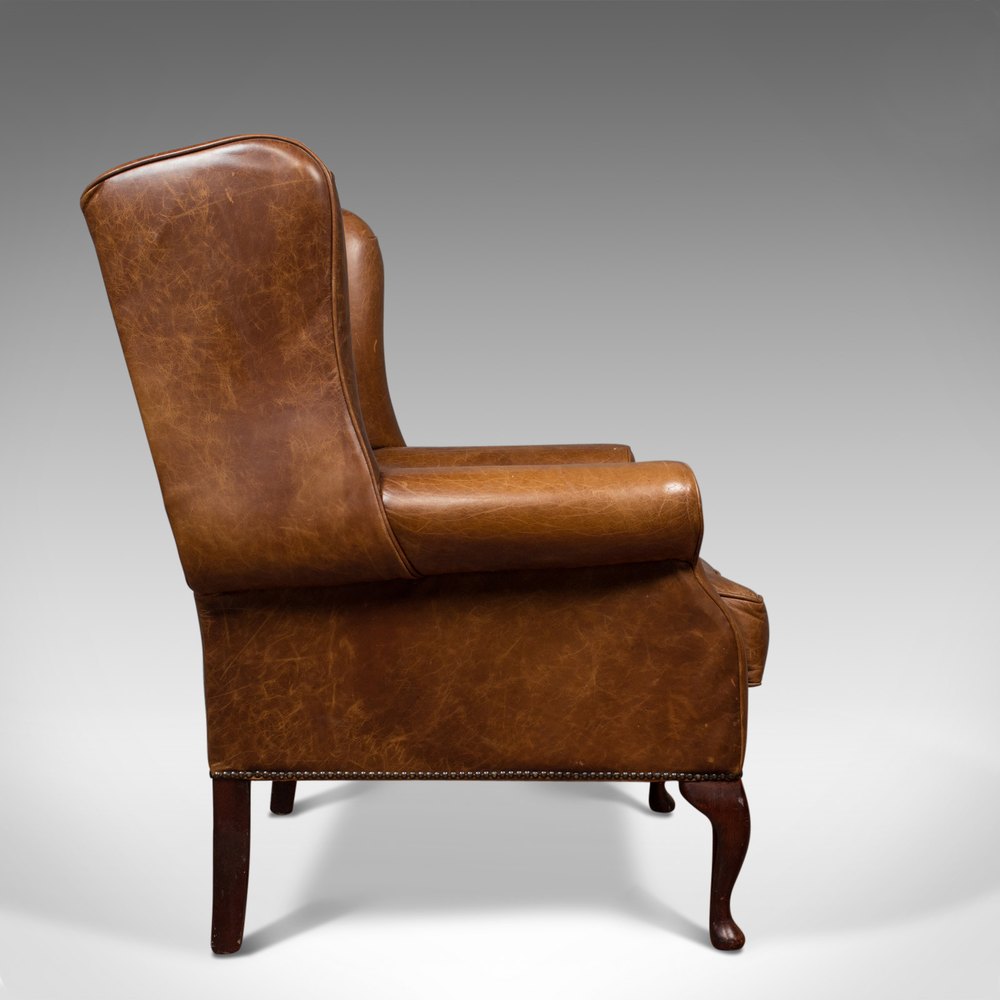 This is a vintage leather armchair. An English, saddle brown, wing-back chair dating to the late 20th century.