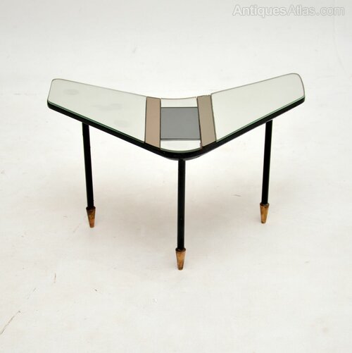 It is really well made with a chevron shaped top made up from segmented mirrored glass of different tones, clear, smoked and peach. It sits on ebonised steel legs with brass feet caps.