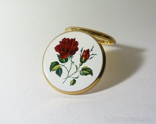 An eye catching Stratton Cachette made in the 1960s. The lid is decorated with crimson roses and contrasting green foliage. The compact is in very good condition. All clasps & hinges work perfectly. The mirror gives a good and accurate reflection. The base is decorated with the all over star design and signed 'Stratton Made in England.'