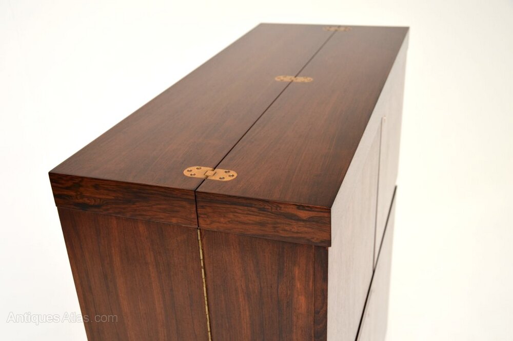 The doors open 180 degrees, the top also flips open to reveal a fantastic bar area. The interior is beautifully fitted out in rosewood, with a black formica base, pull out tray slide shelf, space for an ice bucket and a built in bottle rack in the lower section.