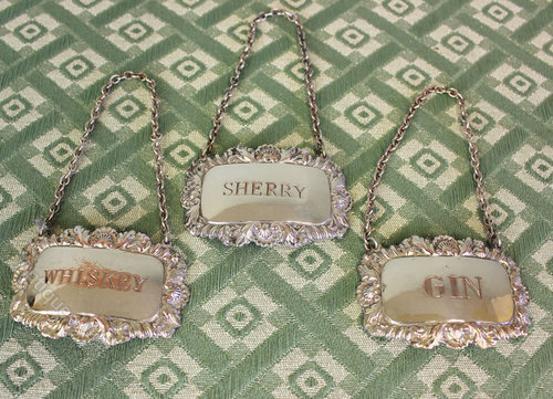 Antique Vintage set of three silver plated decanter labels having decorative edge, the labels marked Gin, Whiskey, Sherry. Slight Rubbing mainly to whiskey label copper coming through, Circa 1930