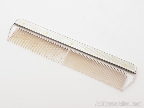 A pretty English silver and guilloched enamelled comb with gold coloured fleur-de-lis and star decoration on white background. Hallmarked Birmingham 1956 and marked 'G & Co Ltd' for the renowned maker Garrard & Co Ltd, London.