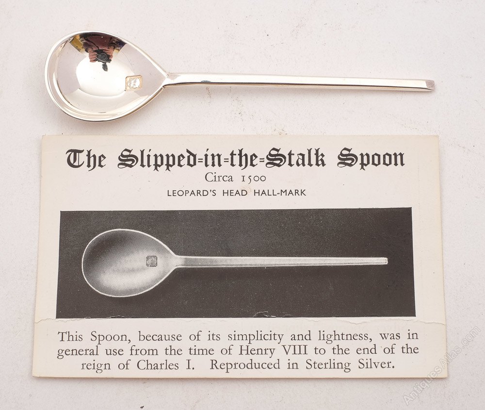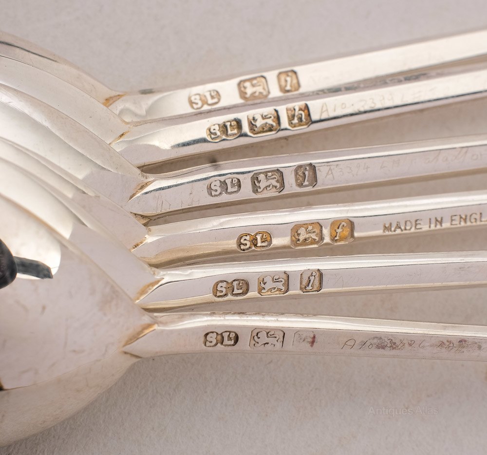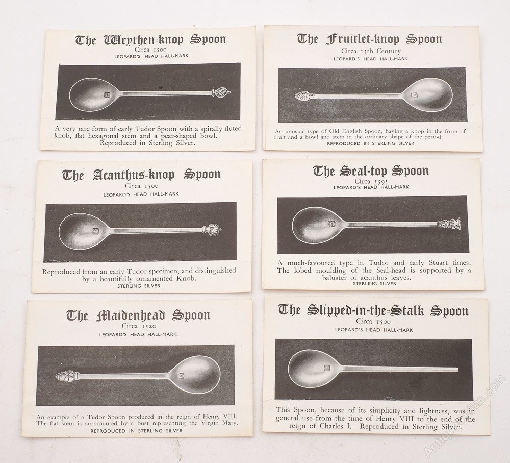 A nice English vintage collection of silver tea spoons, each one a reproduction of a spoon used from a different era of British history. Hallmarked London 1964