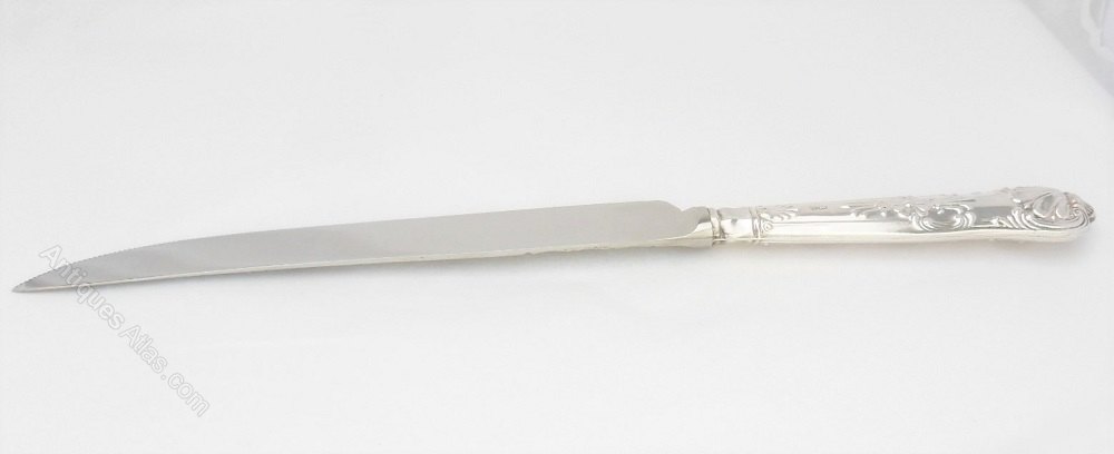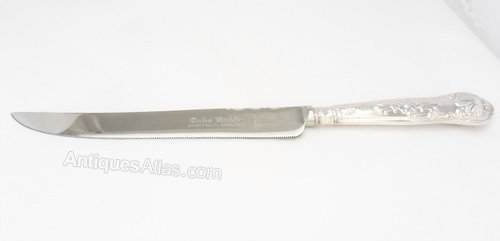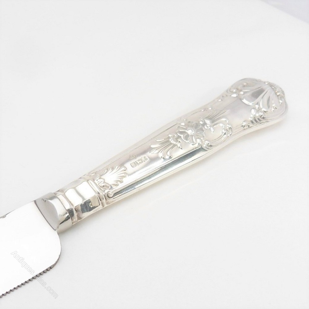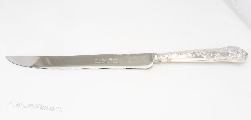 A superb silver handled cake knife with stainless steel blade. The silver handle is nicely decorated and hallmarks are visible for the Sheffield Assay Office with a date mark for 1975. The blade is marked Cake Knife, Sheffield, England, Stainless Steel'.