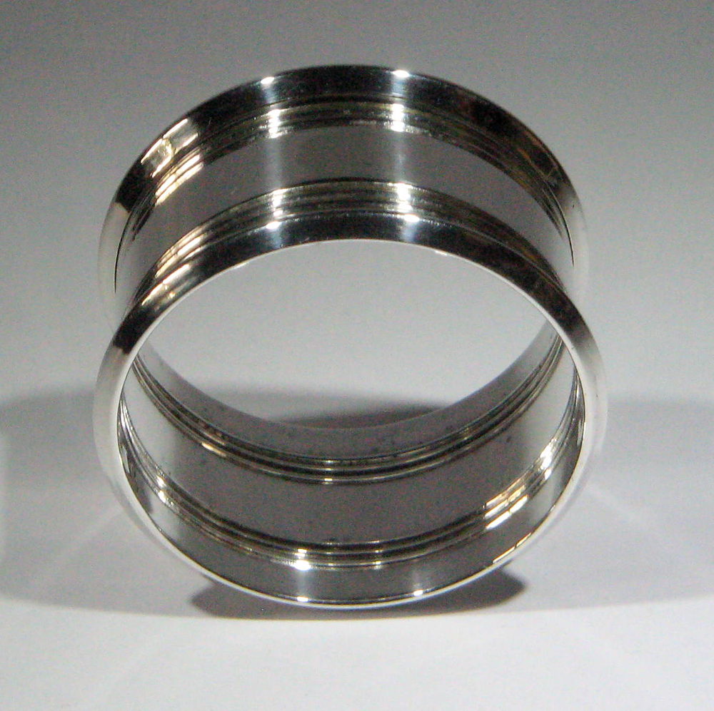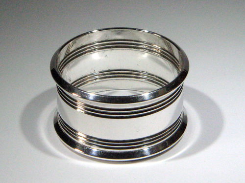 Vintage silver napkin ring with stepped rims & banded decoration.