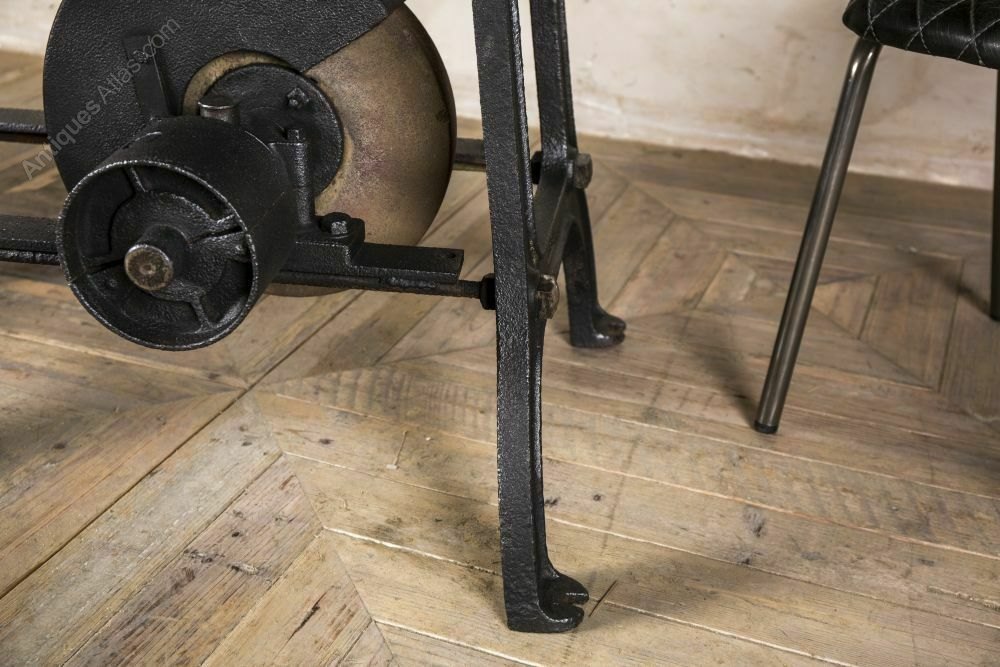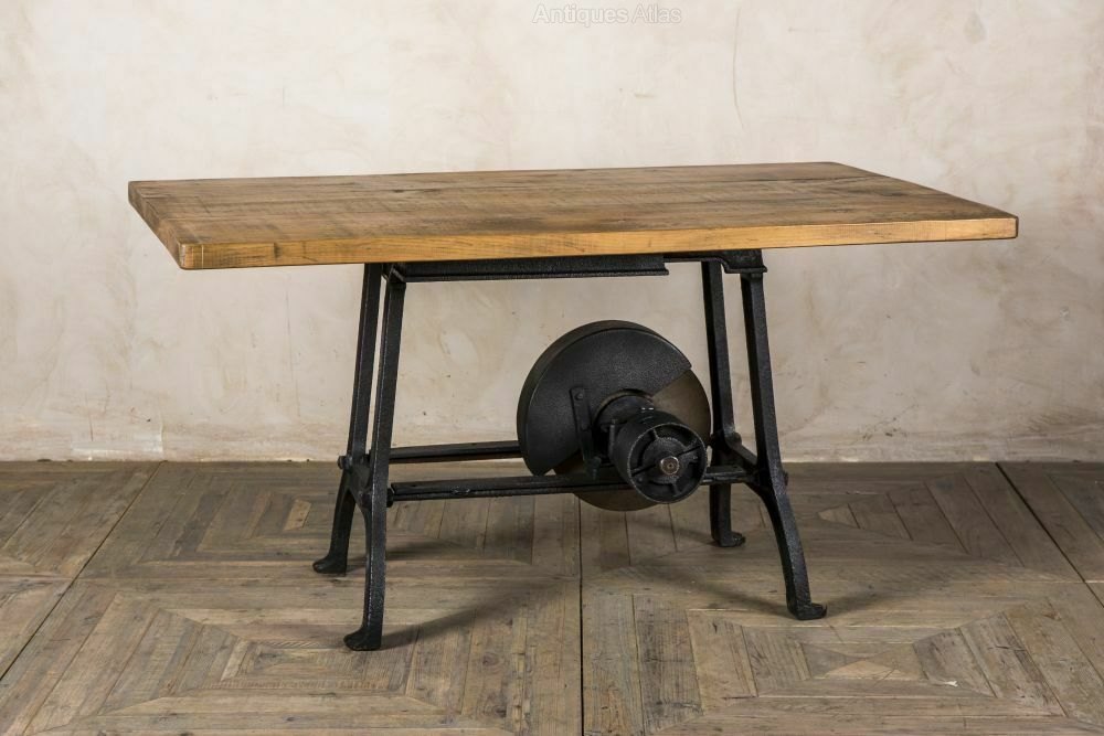 The table has been produced from an industrial grinding stone table. It has been fitted with a reclaimed pine top to make it into a dining table. The table has a cast iron base that adds to its industrial appearance.