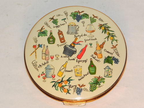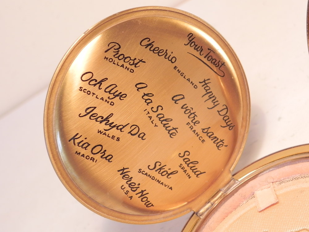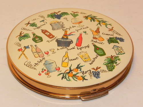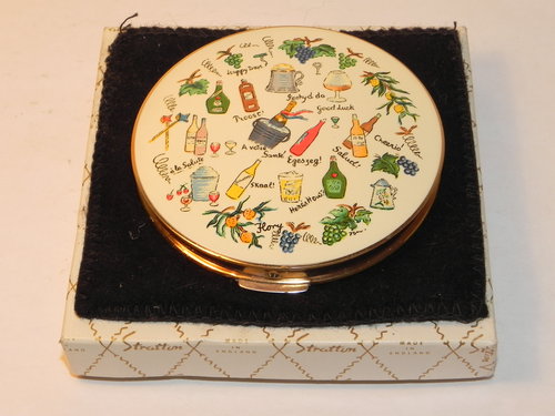 Superb and just a little bit different, this fabulous vintage powder compact by Stratton is a delight, in excellent condition. The enamel finish top is an array of worldwide happy messages "Cheers" "Good Luck" "Happy Days" some in different languages (but don't worry there is a secret translation behind the inner opening lid!) with pictures of wine glasses, alcohol and grapes, measuring 2.3/4" inch, it is set to a gold tone case - all clasps and hinges are perfect opening to reveal a nice clear mirror a clean interior with an inner opening lid, a clean puff and sifter. There is a black pouchette and box also present. A feint smell of powder, but I doubt this little beauty has been used - A really nice piece, with a great theme that I am sure will delight the most discerning of buyers!.