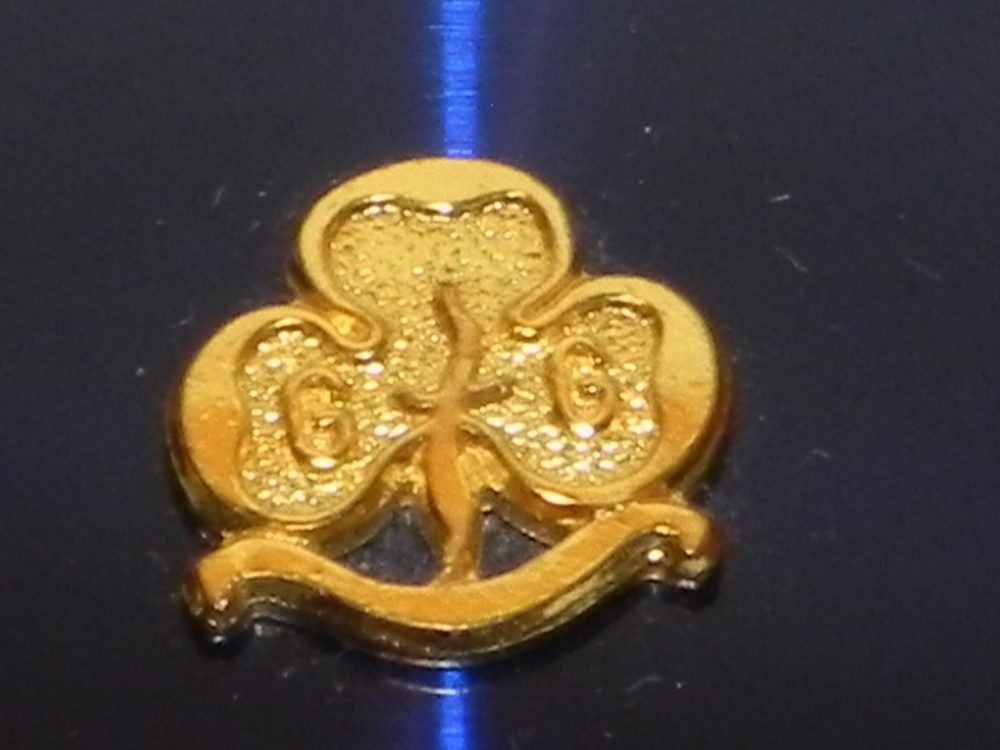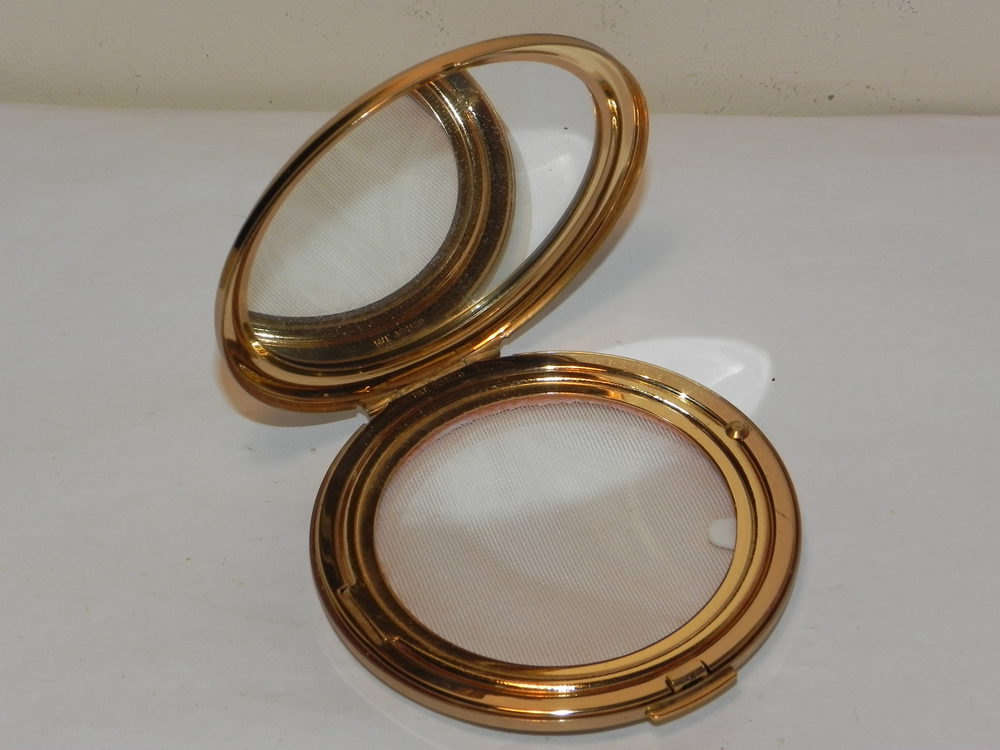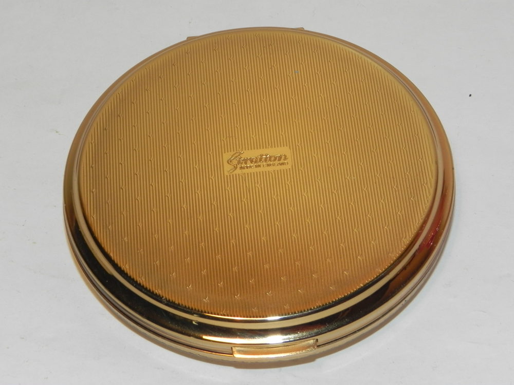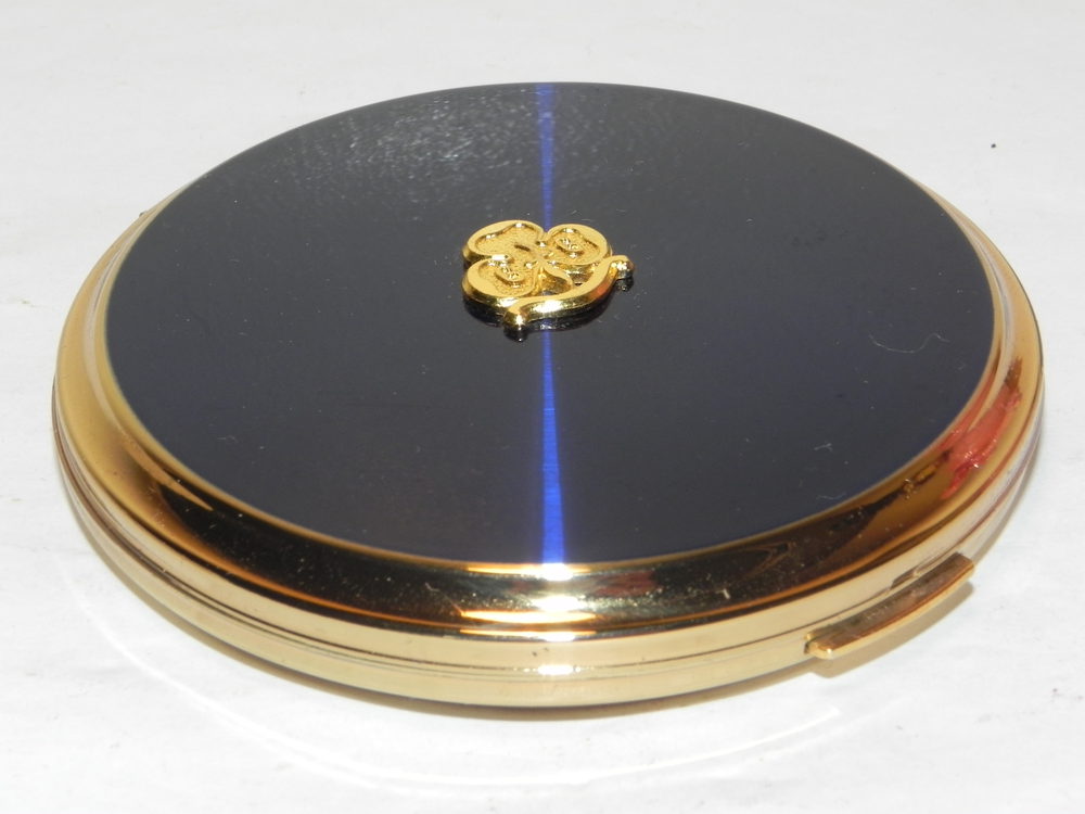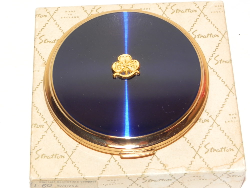 In absolutely beautiful, unused condition, this boxed Stratton Powder compact is fabulous! - In a deep irridescent navy blue with the Girl Guide Trefoil Logo to the top - c.1960's all clasps and hinges perfect, opening to reveal fitted sifter, the pouchette and box are also present. Measuring c. 3.1/4" inch diameter - this is a must have addition for any collection!.