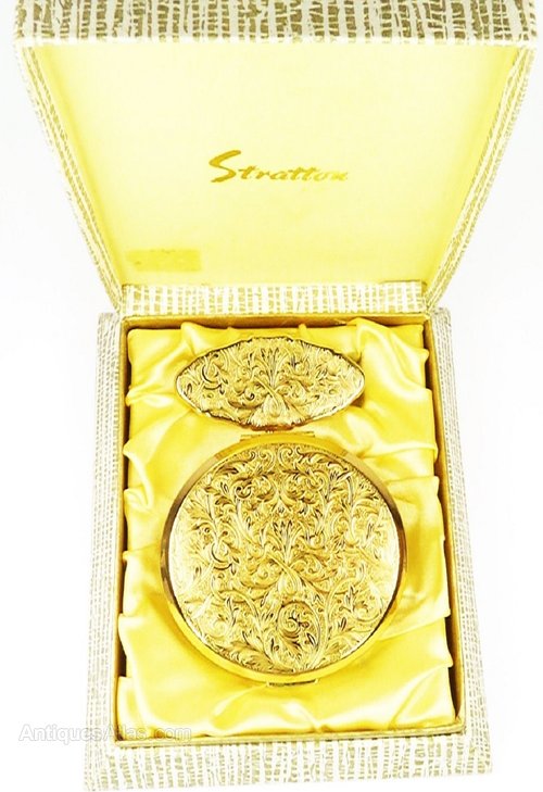 A beautiful vintage Stratton vanity set comprising a compact mirror and lipstick holder mirror presented in the original gift box. Crafted in the 1970s the gorgeous lids are adorned with gilt scrollwork. The mirrors give accurate and clear reflections. All clasps and hinges work perfectly. The whole set is in excellent condition. The compact is suitable for all loose face powder and standard sizes of pressed powder (67 mm diameter). The Lipview is suitable for all widths of lipstick cases. The Mini-Convertible compact measures 3 inches diameter and weighs 75 grams. The Lipview measures 2 1/2 inches and weighs 19.5 grams.