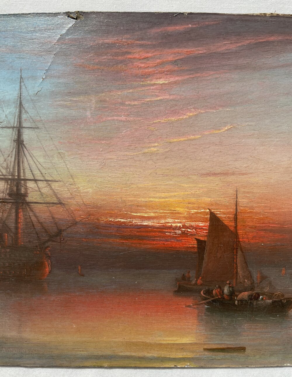 This is a delightful little painting by William Crawhall depicting a large contemporary battle ship and associated tenders at sunset. It is exceedingly well painted and has a very strong Turner influence to the scene.