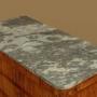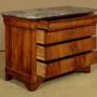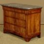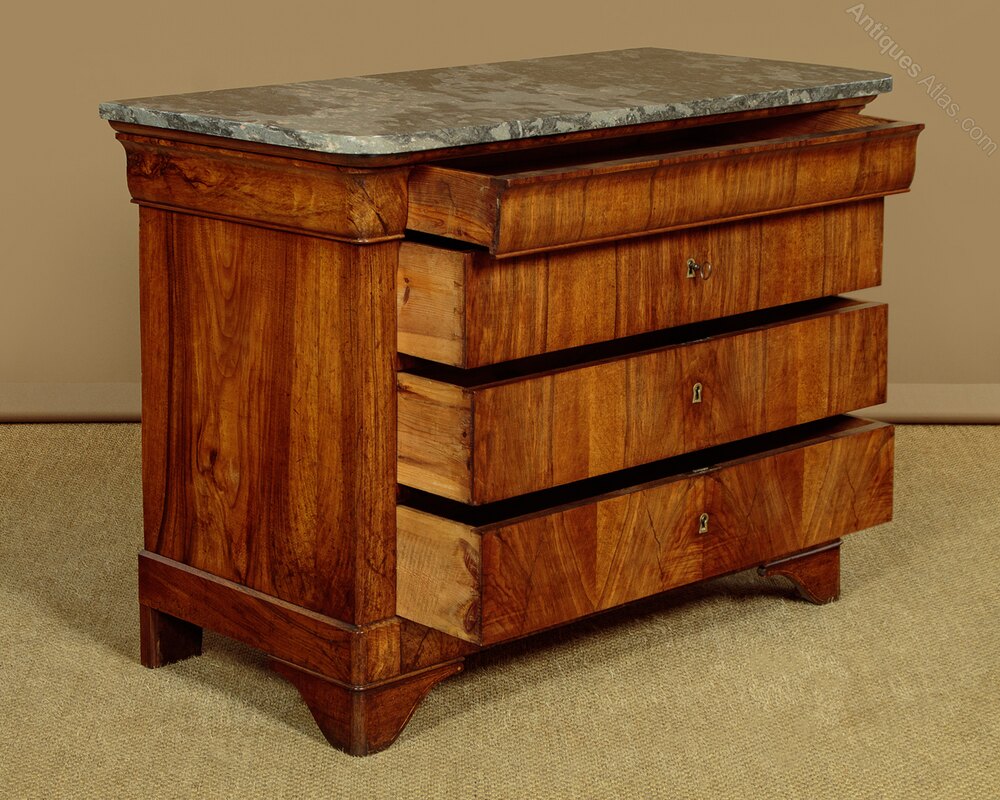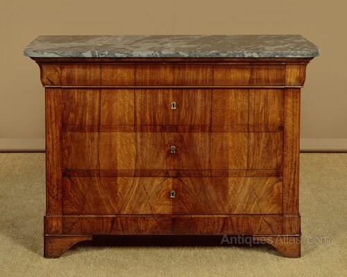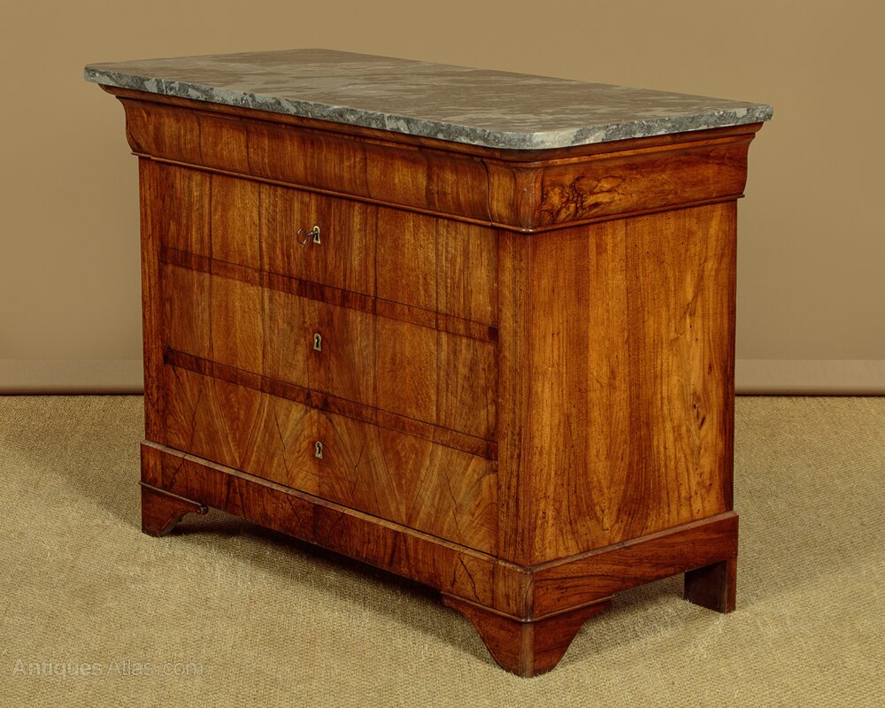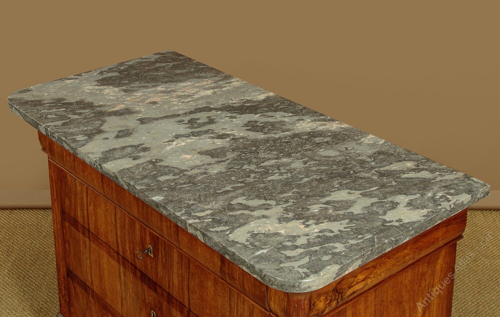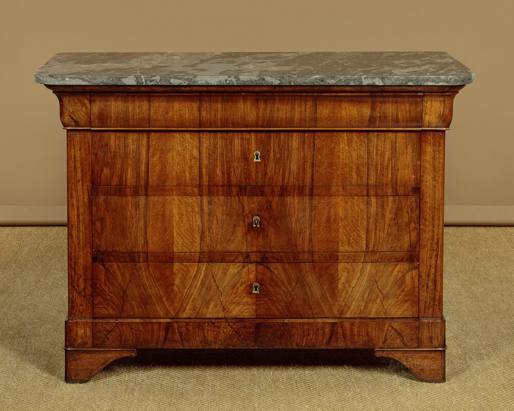 French marble top commode chest of drawers c.1870. Original inch-thick marble top, beautifully figured in greys and pink, with rounded corners. Over a chest of four drawers. Walnut veneers arranged in a striking symmetrical pattern across the front. Shallow top drawer with shaped front continued on the sides of the chest, three deeper drawers below with large inlaid brass escutcheons. Solid walnut sides, slim plinth veneered to match and raised on shaped bracket feet with inlaid detail to the front. Excellent colour and condition, cleaned and waxed in our workshops. Key supplied.