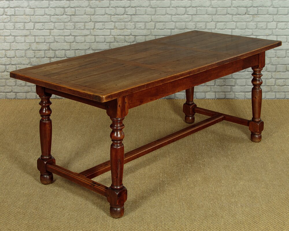Sturdy kitchen dining table in walnut and oak c.1900. 70½" x 30½" top made from walnut boards within an oak frame. Walnut apron (knee height 23") and turned legs joined with moulded oak stretchers. Some shrinkage to the boards on the top, otherwise excellent colour and condition, cleaned and waxed in our workshops.