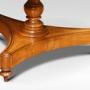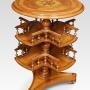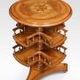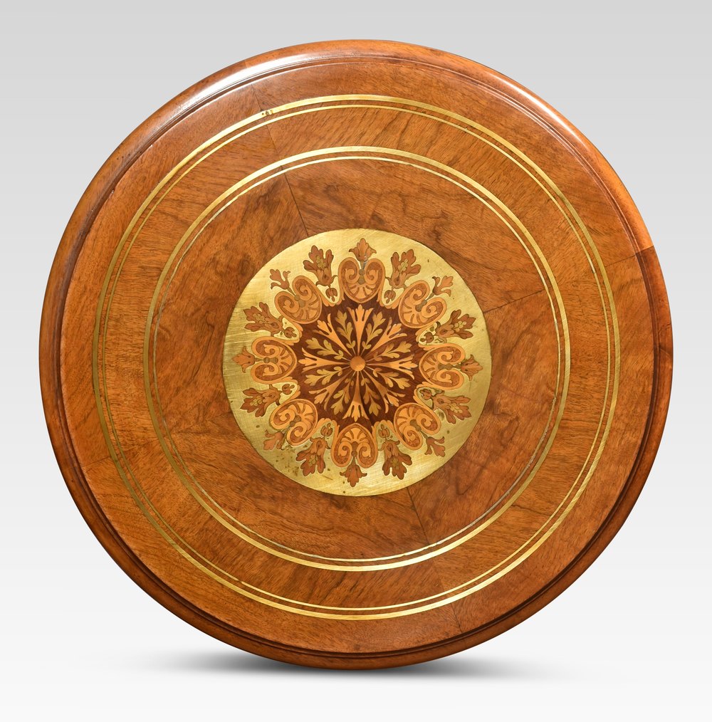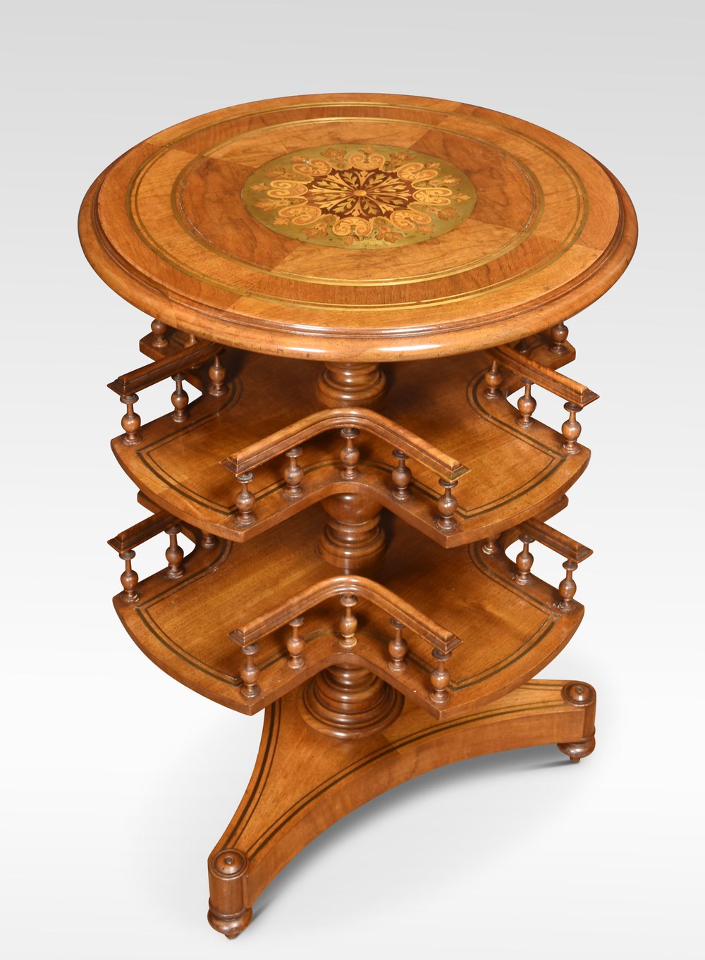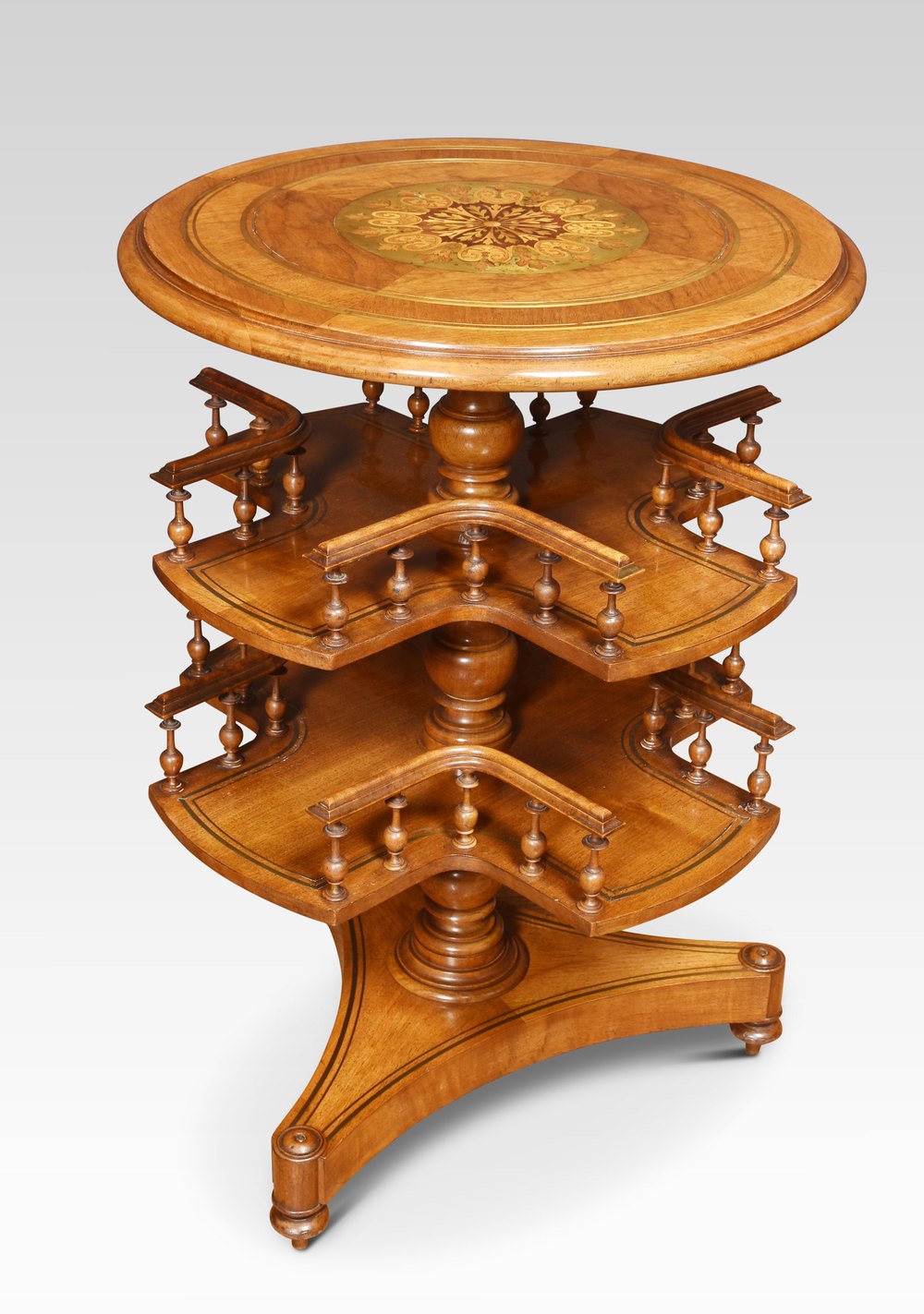 19th-century book table, the circular top with marquetry and brass inlay, above two shaped tiers with spindle gallery. All raised up on trefoil base, terminating in turned feet.