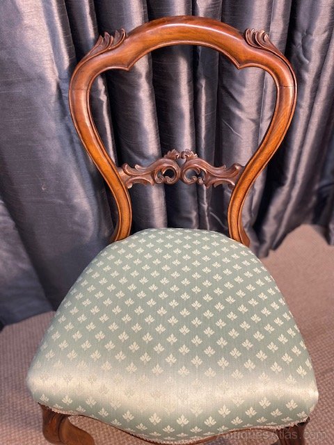 This pretty walnut single chair, with carving to the back and to the top of the chair, covered in a mint colour fabric with pattern, ideal for a dressing table or as a hall chair standing on cabriole legs.