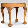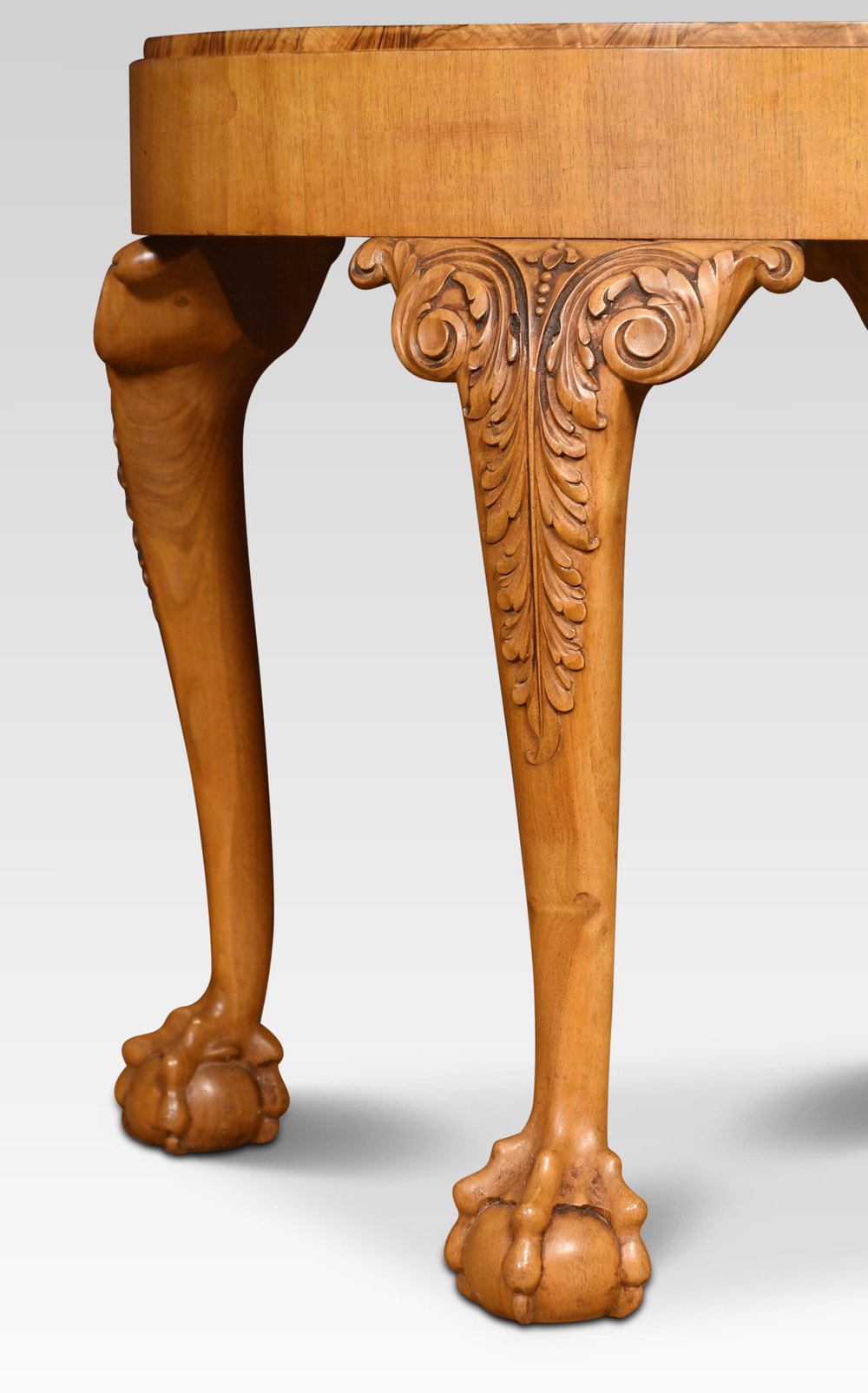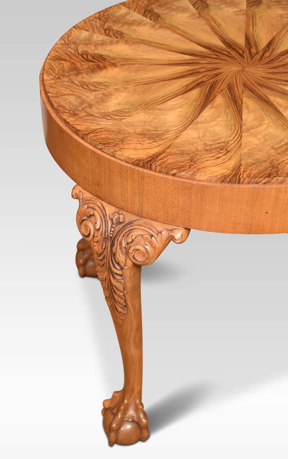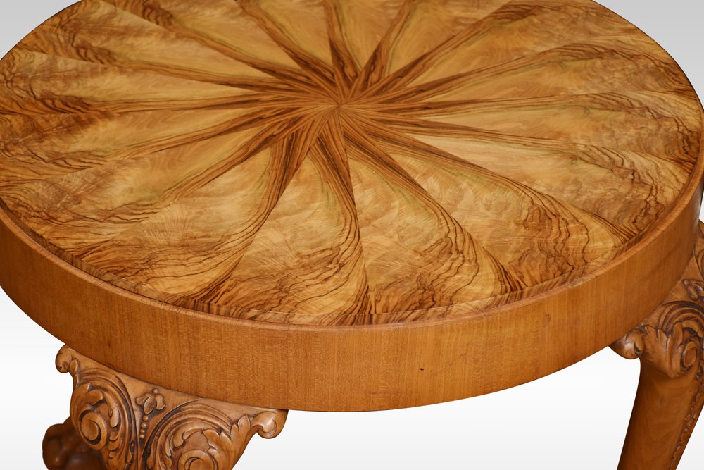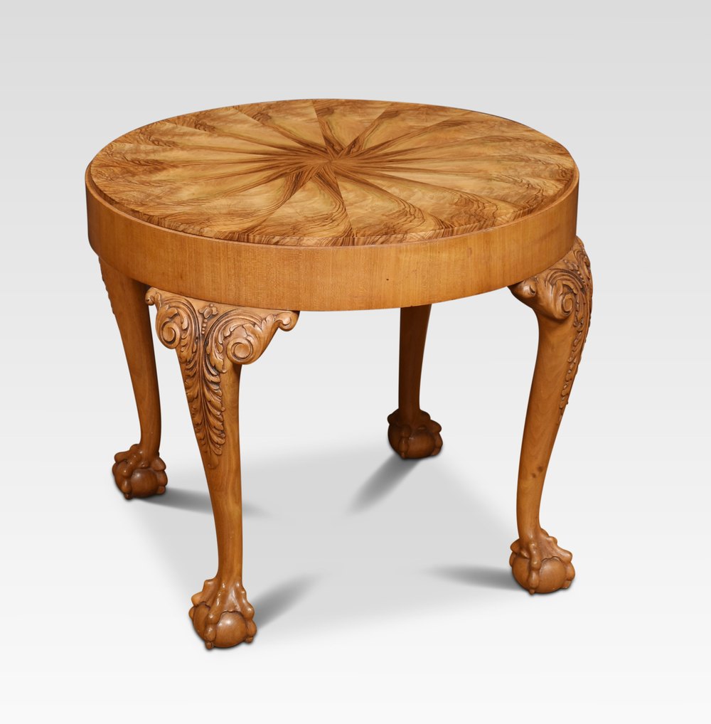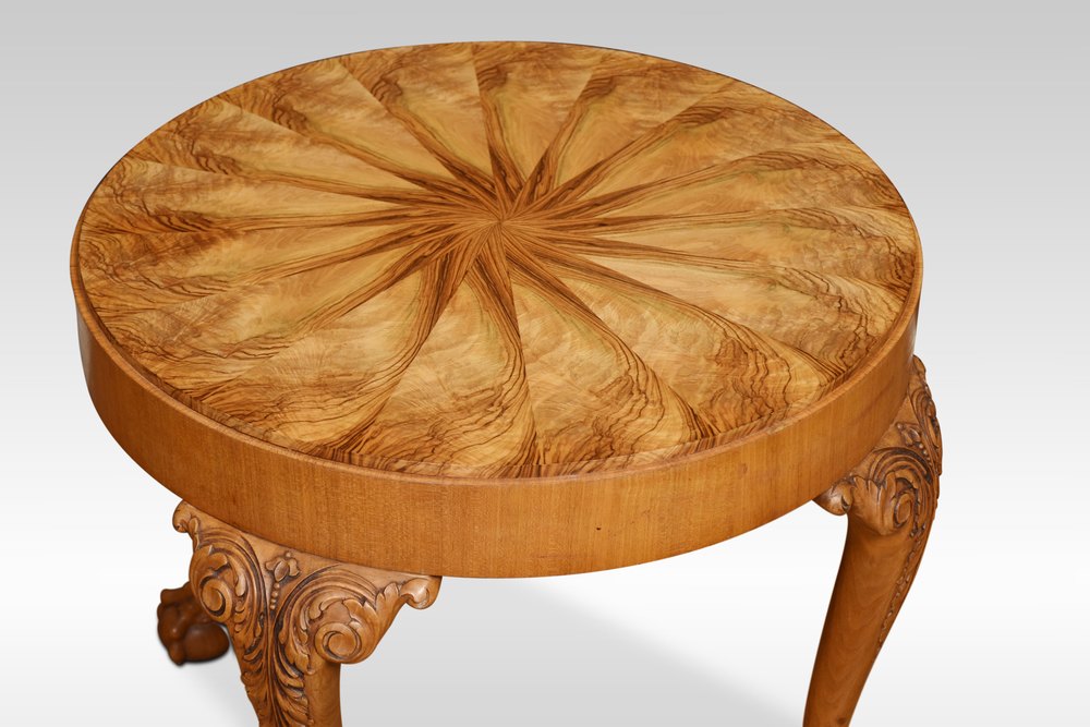 Walnut coffee table the circular well figured top raised up on four carved cabriole legs terminating in claw and ball feet.