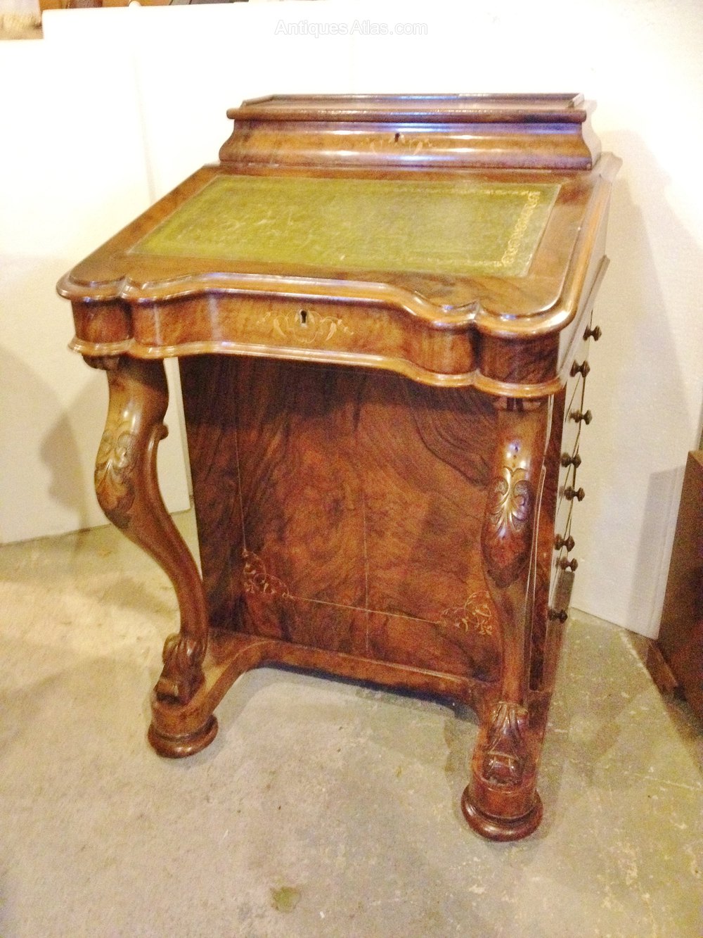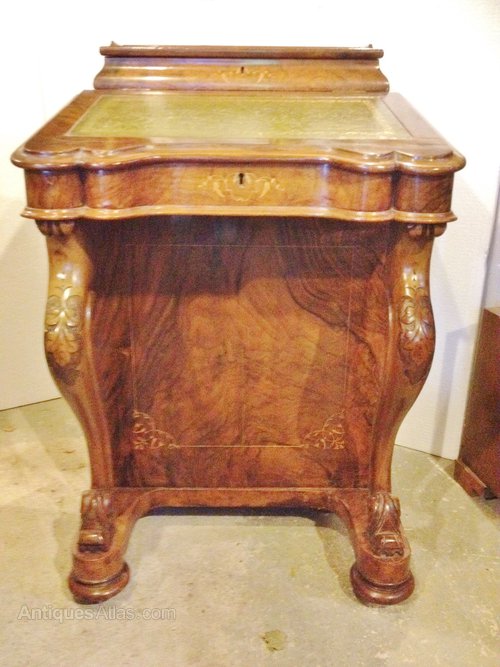 this delightful desk has been through our workshop but only required a wax polish and burnish to show off the full beauty of the walnut. All the drawers run smoothly, the green embossed leather writing surface is fine and the internal drawers and top stationary compartment are in good order. A super antique davenport desk, ready to be placed in the home.