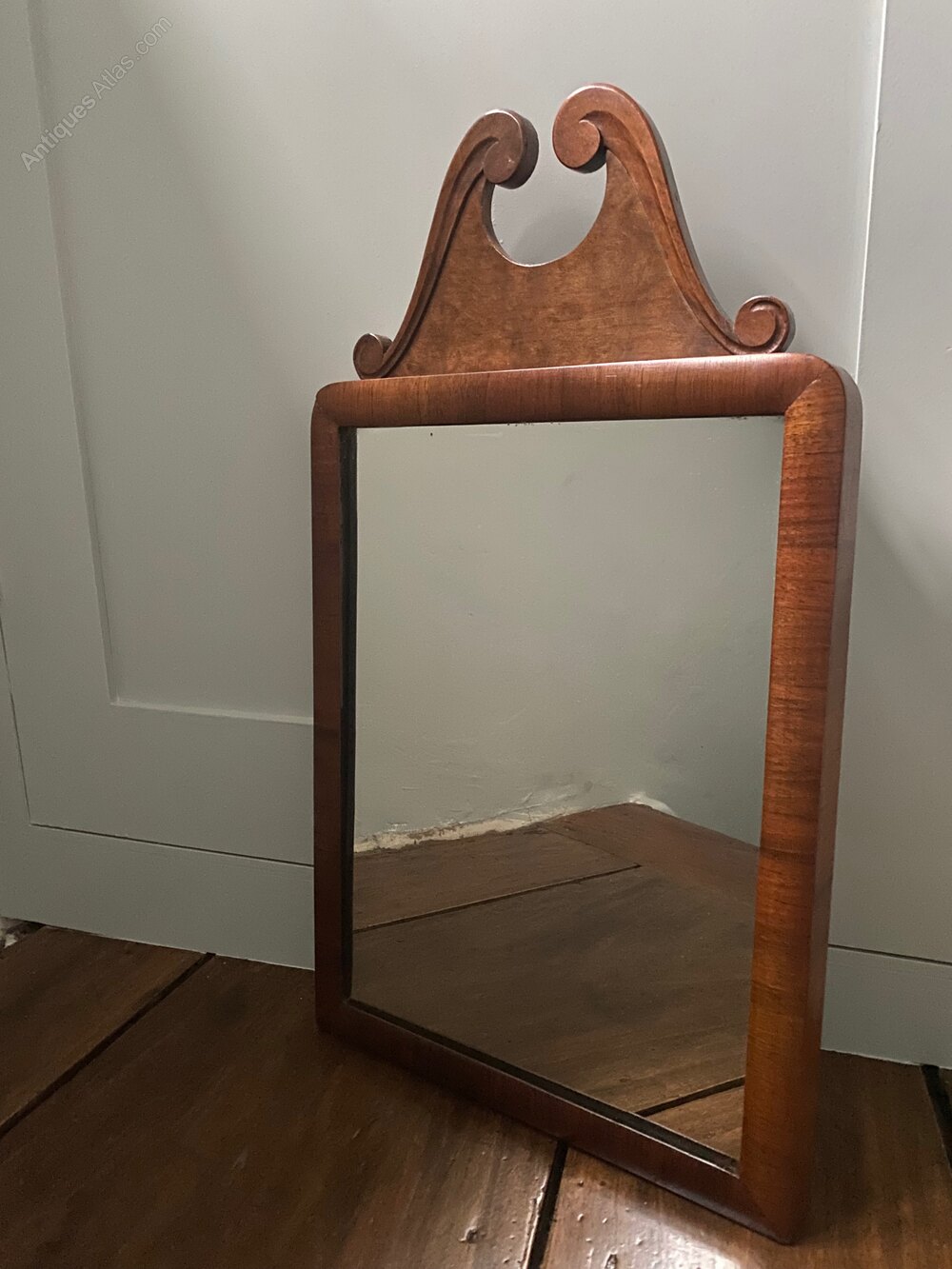 Cushion shaped frame with walnut veneer. Elegant swan neck pediment to top.